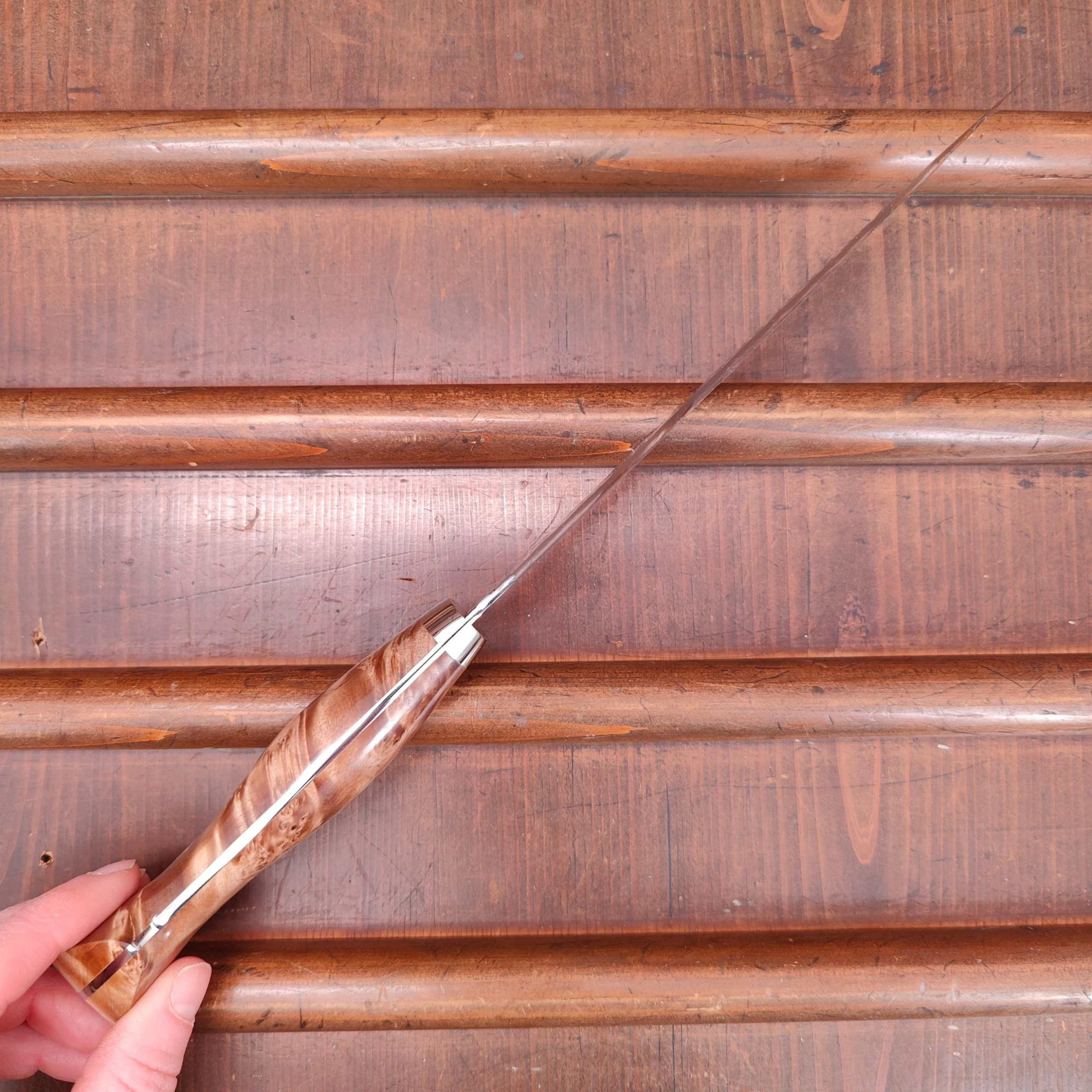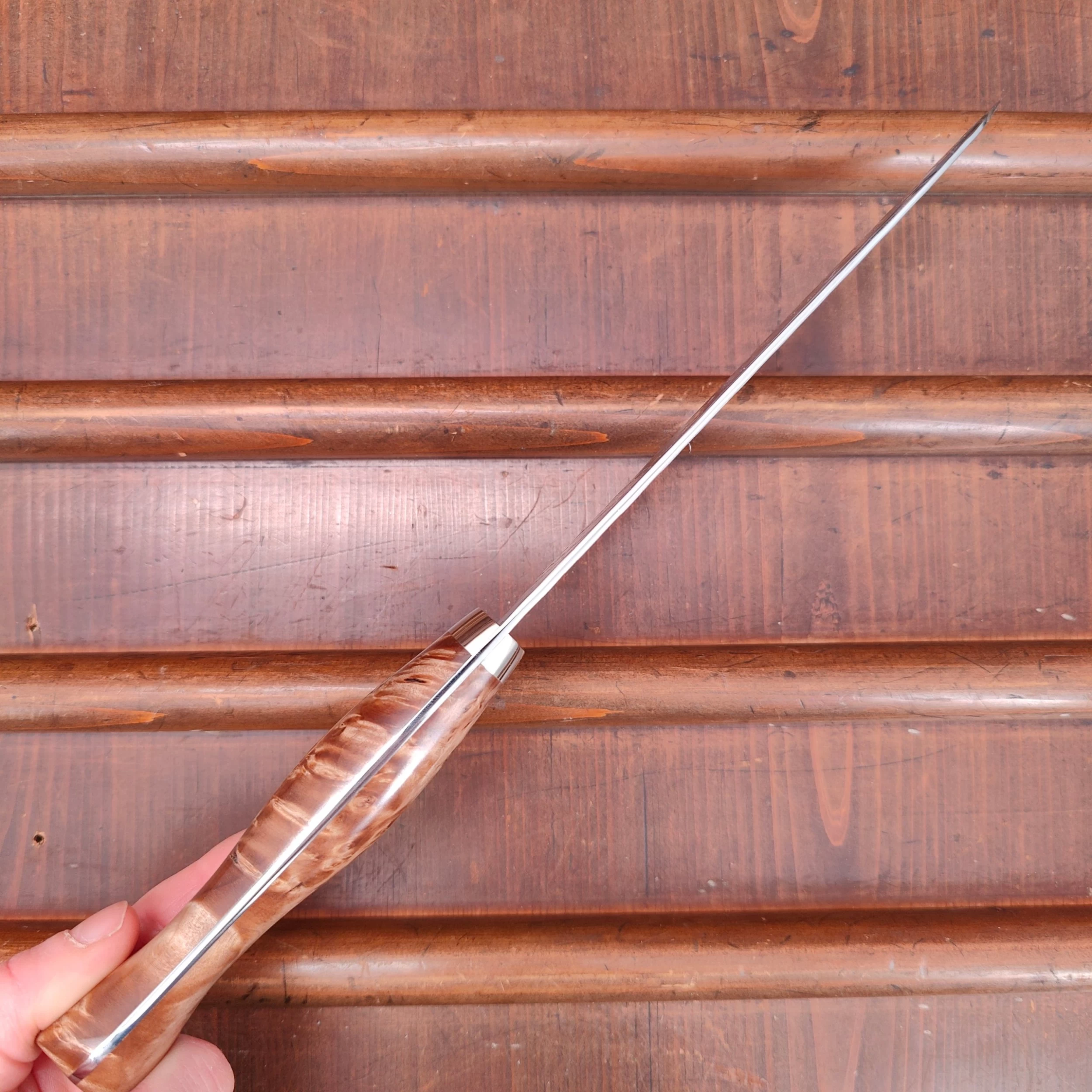 Forged stainless clad SG2 powder metal with migaki finished hammer marked tsuchime cladding and western style stabilized maple burl wood handle. SG2 takes a very fine edge easily for a stainless steel of its hardness (63/64) and holds it nicely.