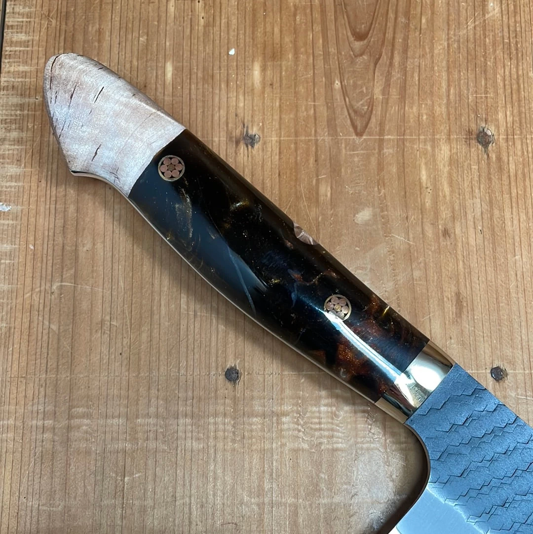 Forged stainless clad SG2 powder metal with hammer marked tsuchime cladding and octagonal wenge handle. SG2 takes a very fine edge easily for a stainless steel of its hardness (63/64) and holds it nicely.Â
