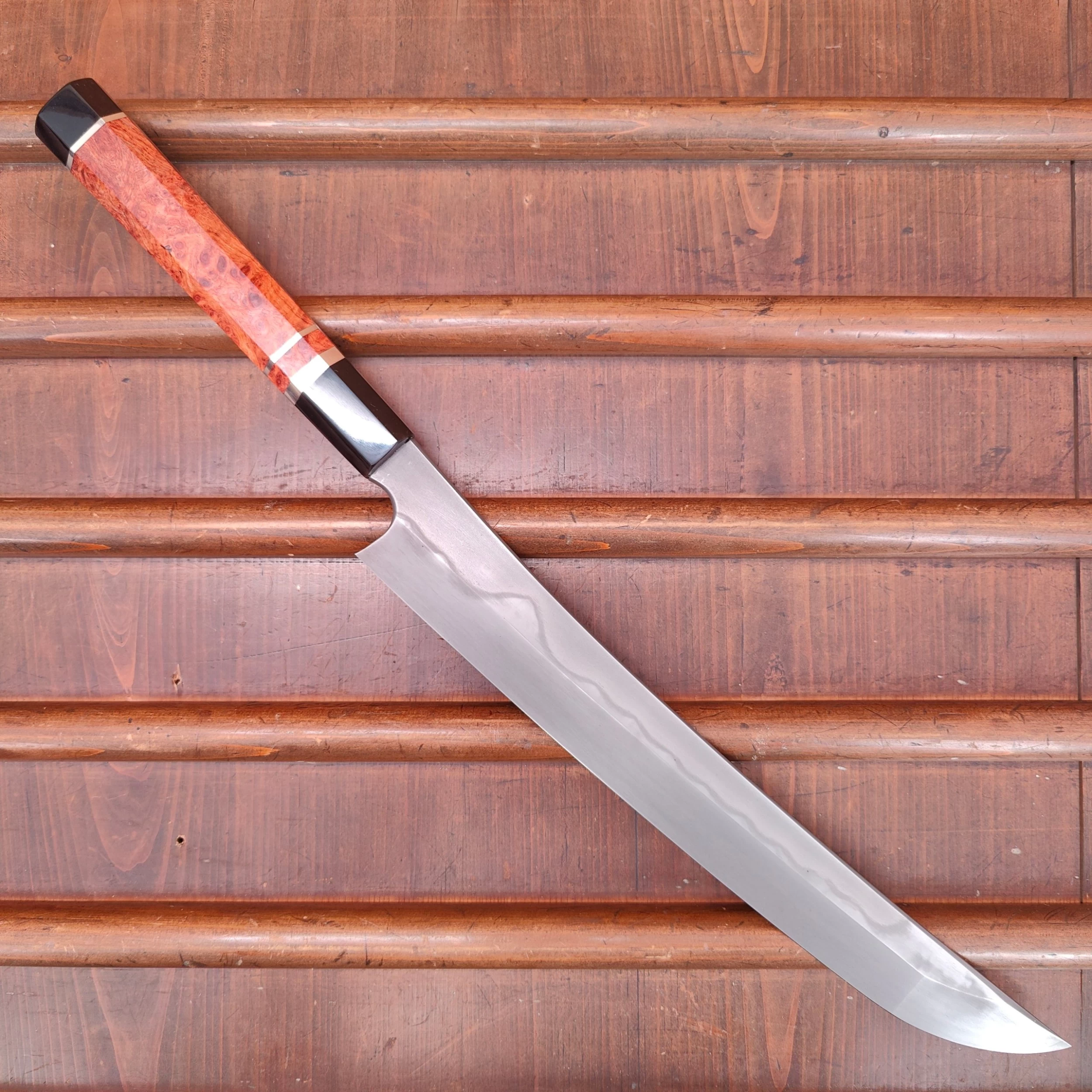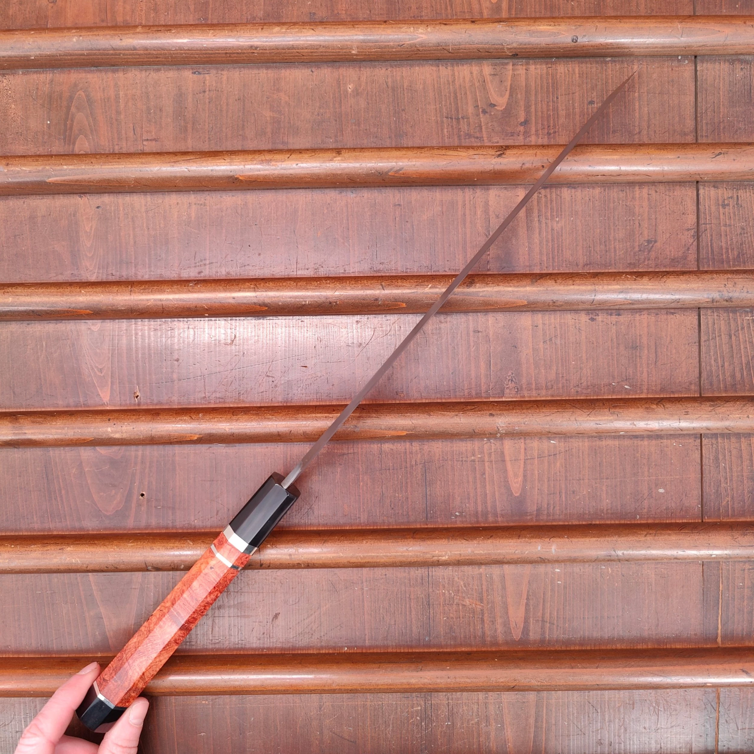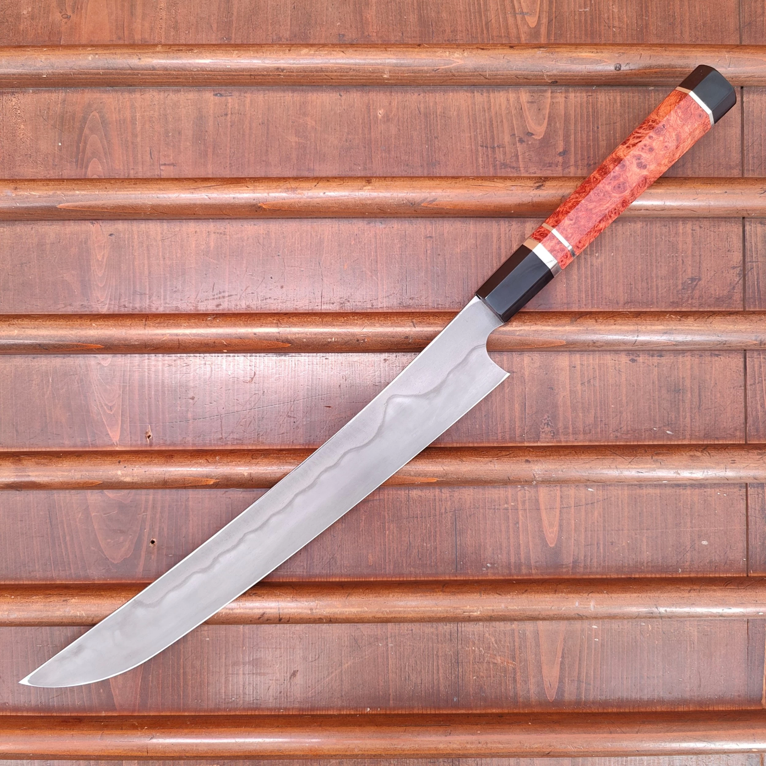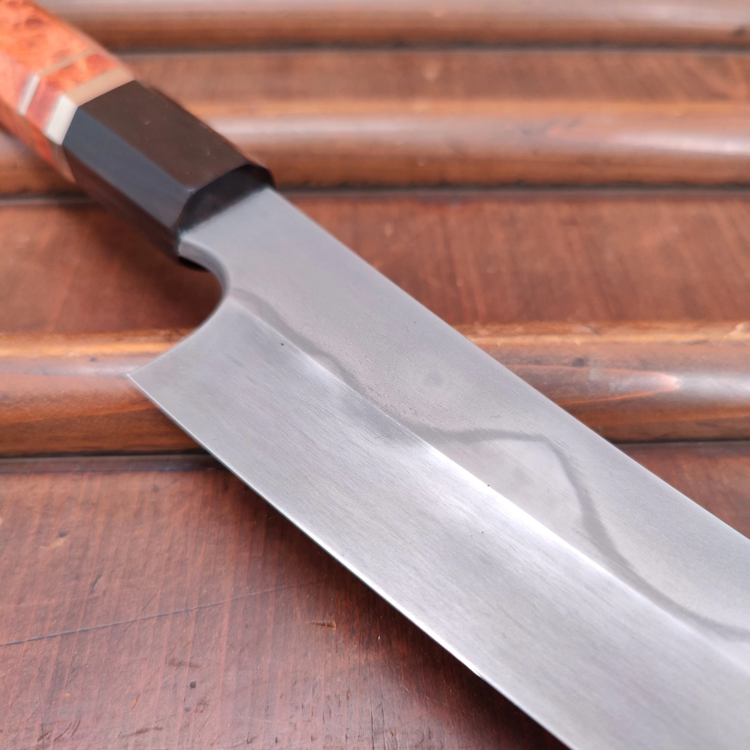 honyaki (water quenched) Aogami #2 yanagi with karin wood handle with buffalo horn spacers.