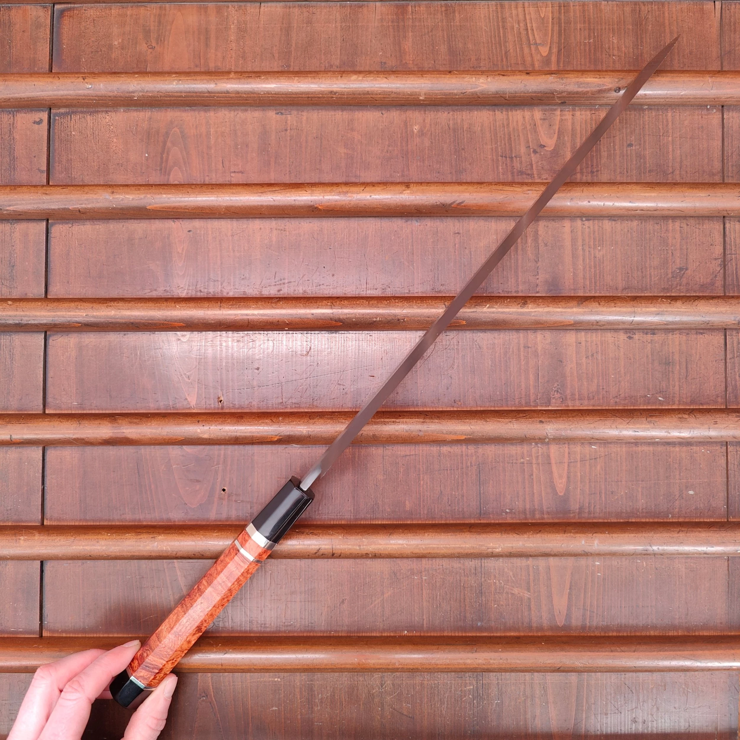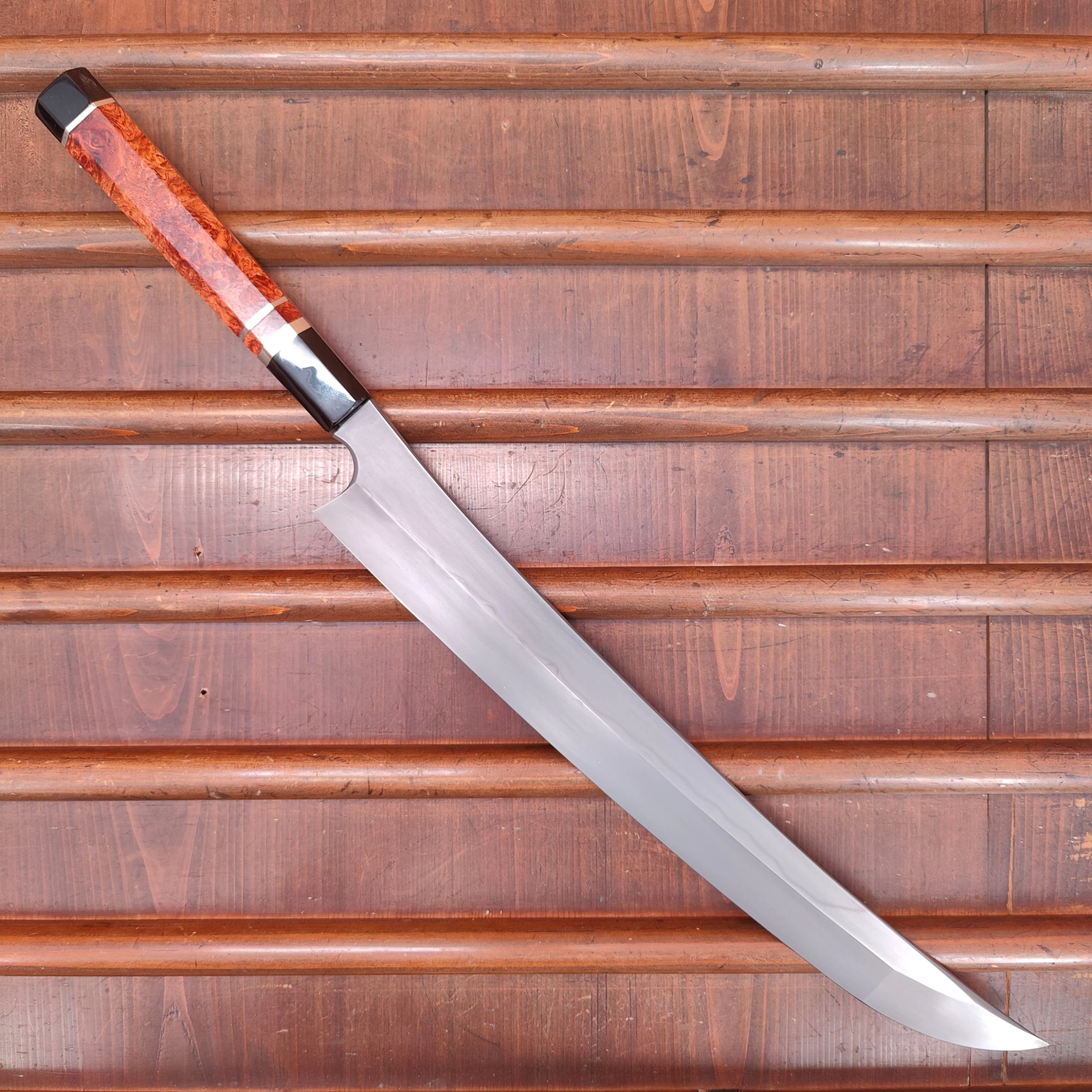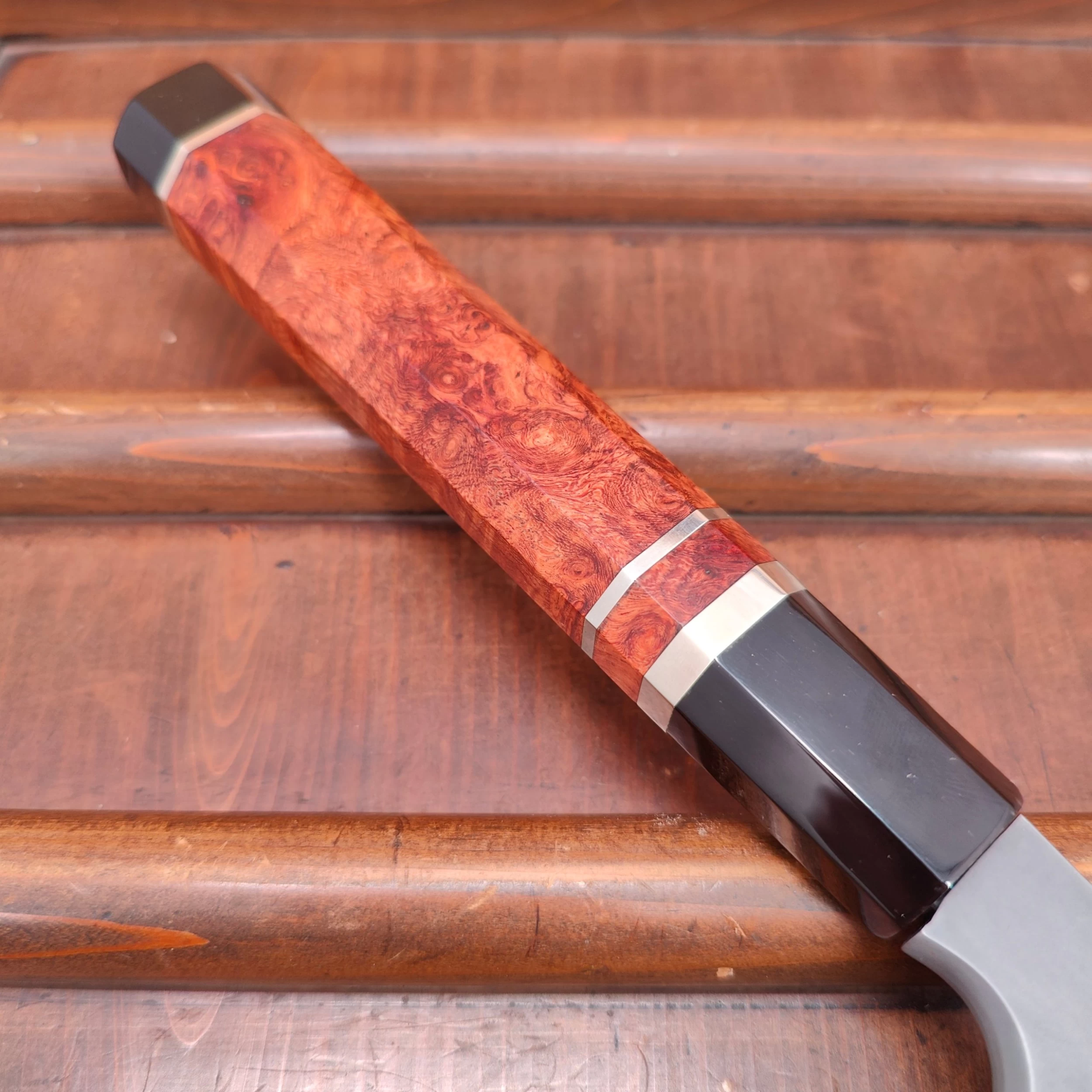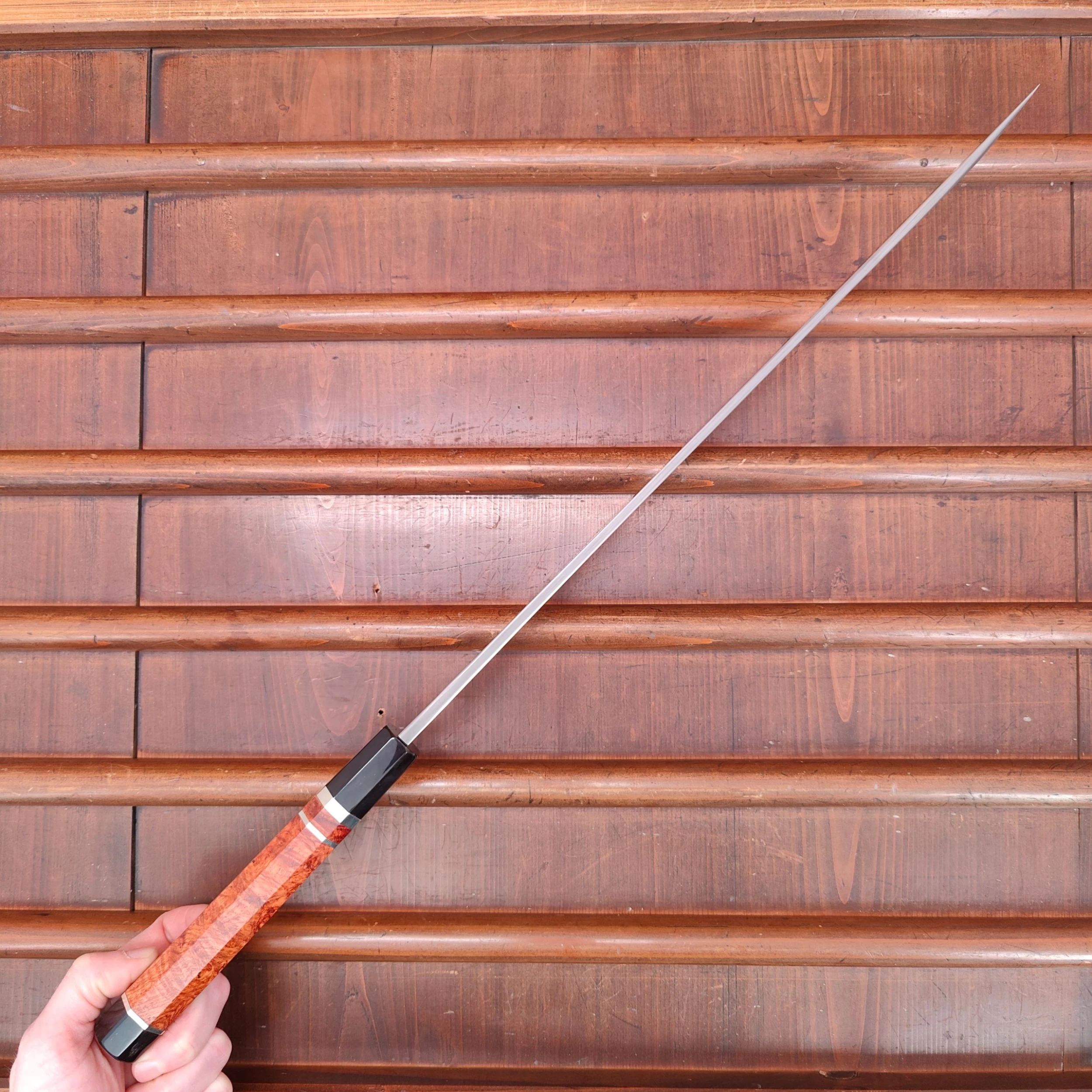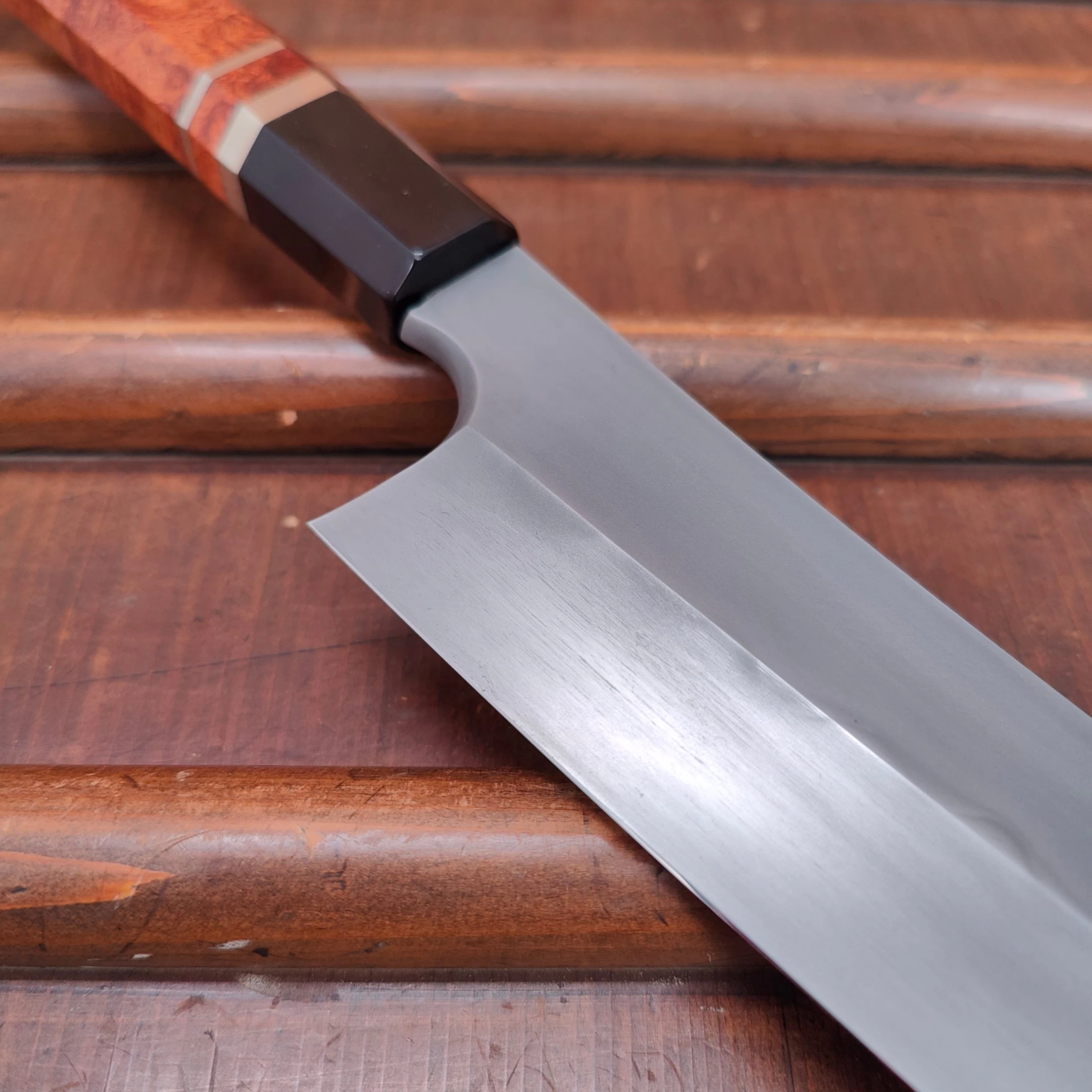 honyaki (water quenched) Aogami #2 yanagi with karin wood handle with buffalo horn spacers.