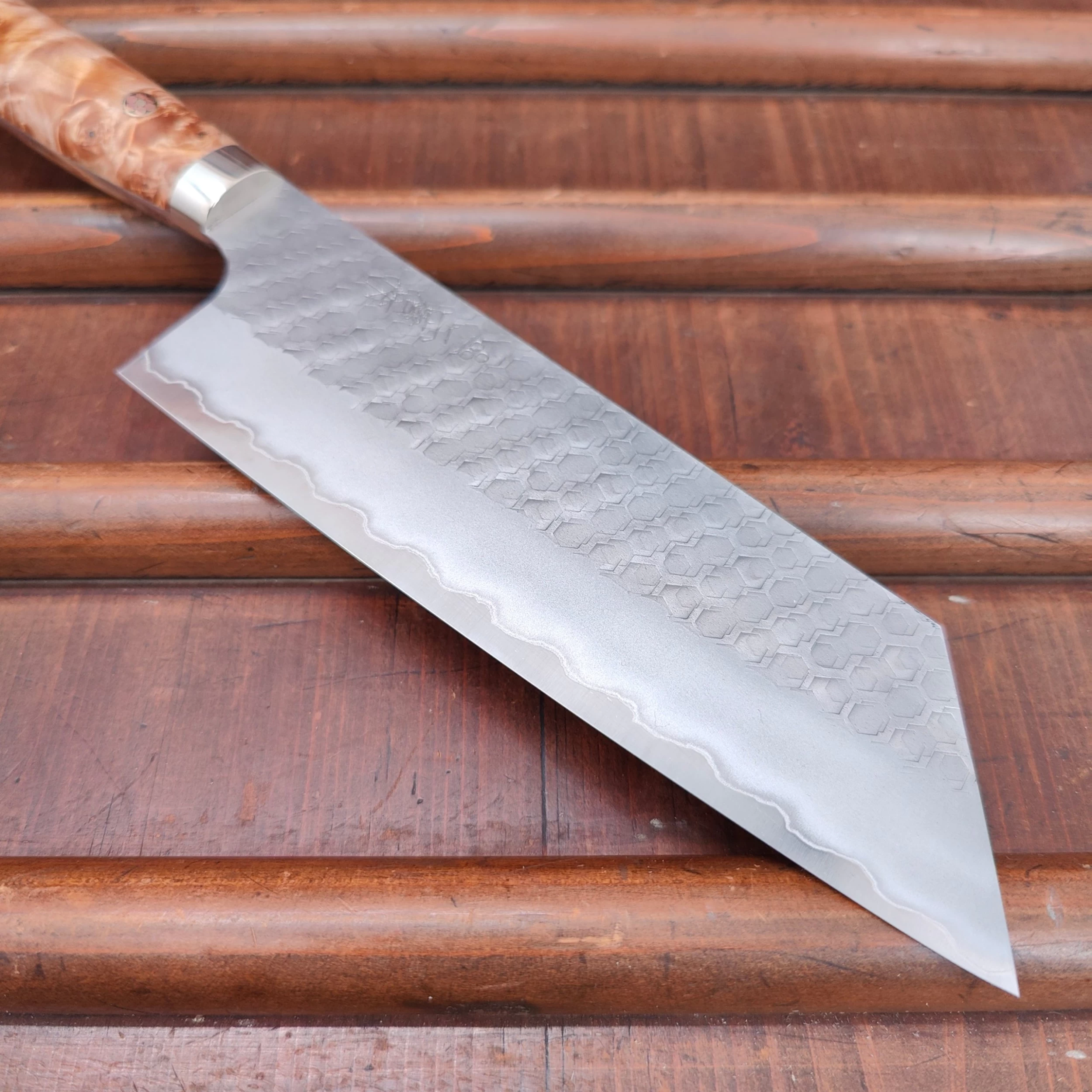 Forged stainless clad SG2 powder metal with migaki finished hammer marked tsuchime cladding and western style stabilized maple burl wood handle. SG2 takes a very fine edge easily for a stainless steel of its hardness (63/64) and holds it nicely.