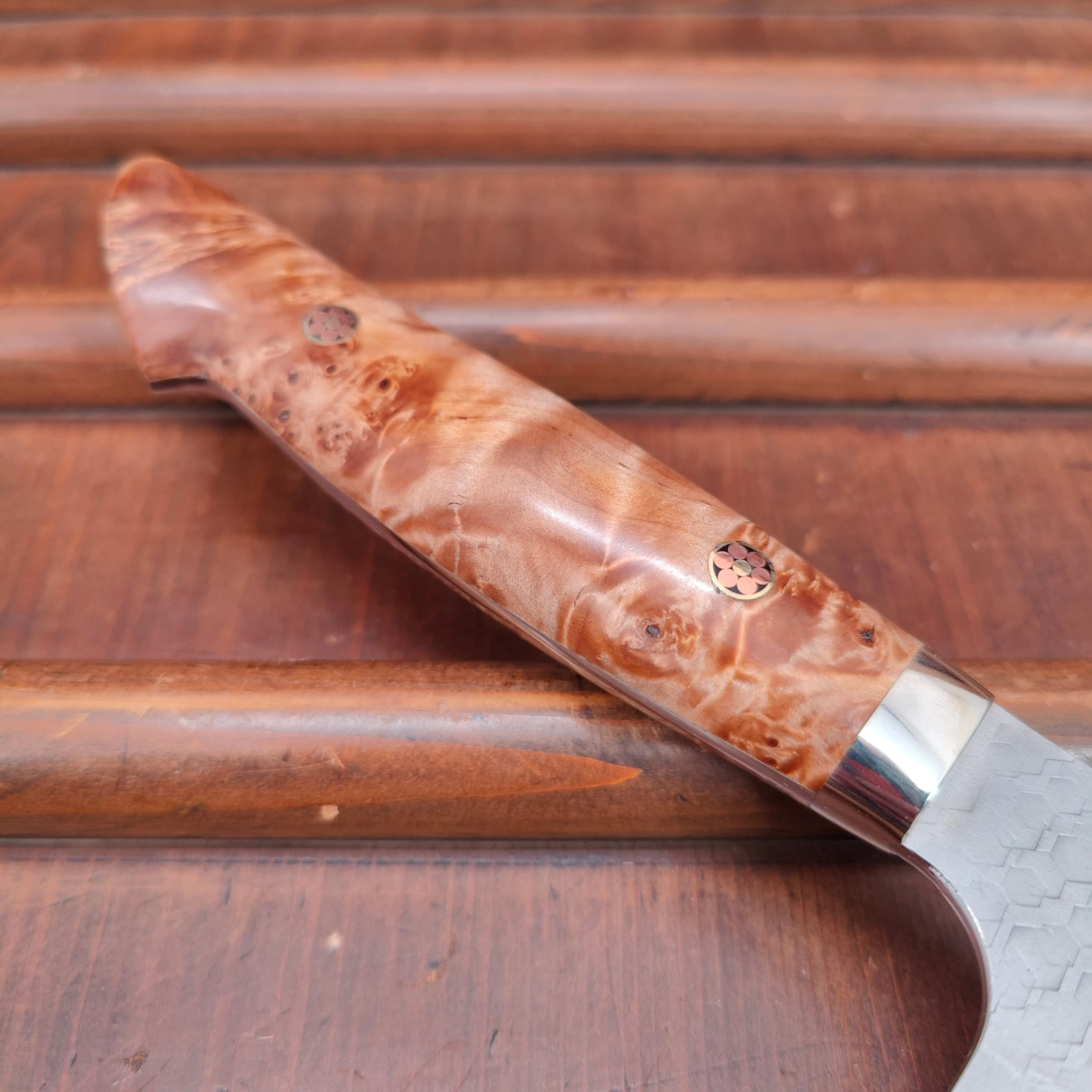 Be the first to review “Nigara Hamono SG2 180mm Kiritsuke Nakiri Migaki Tsuchime Stabilized Maple Burl Western Handle” Cancel reply