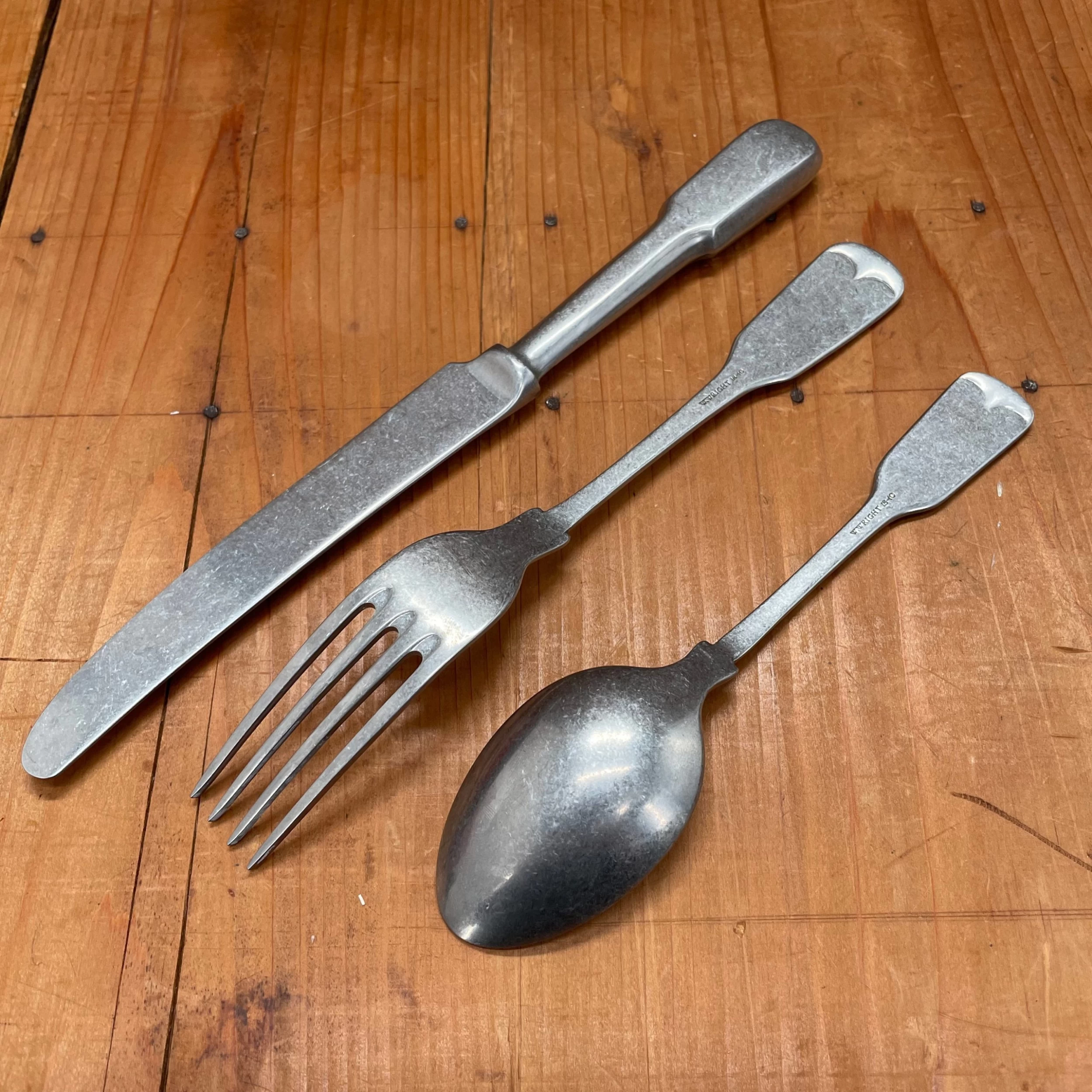 Made in Sheffield England by the W. Wright company in stainless steel. This tableware is able to withstand the rigors of a busy restaurant or hotel dining room without sacrificing a graceful feel in hand. This is true during dining as well, highlighting the intentional balance that keeps them from easily pitching off a plate. The tumbled finish provides a nice smooth texture and will keep scratches from standing out.