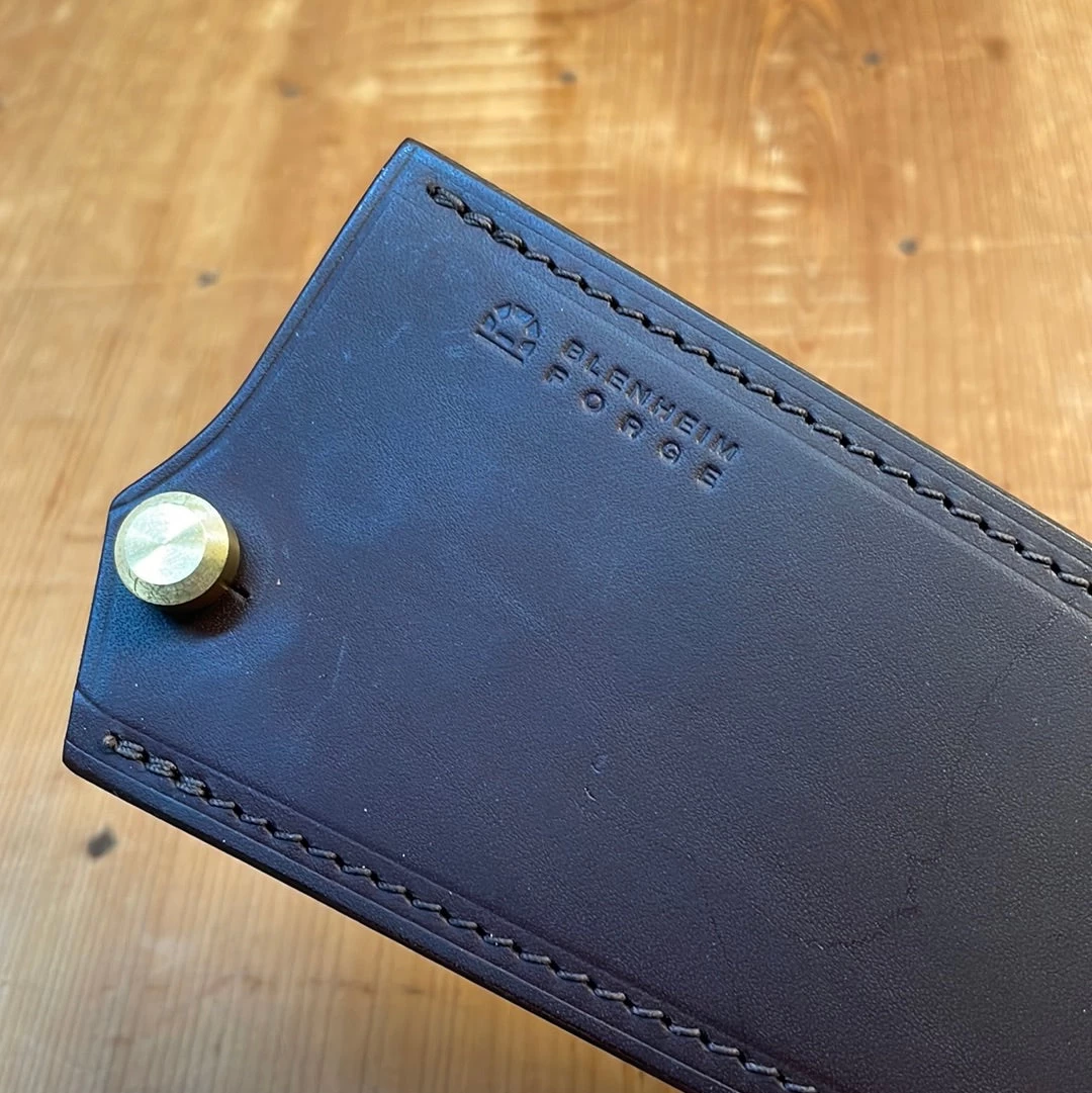 Dark brown Belgian mat finished leather sheath for Blenheim Forge Stainless Clad Range Gyuto handcrafted by Harry Owen of Owen Leather in Peckham London.