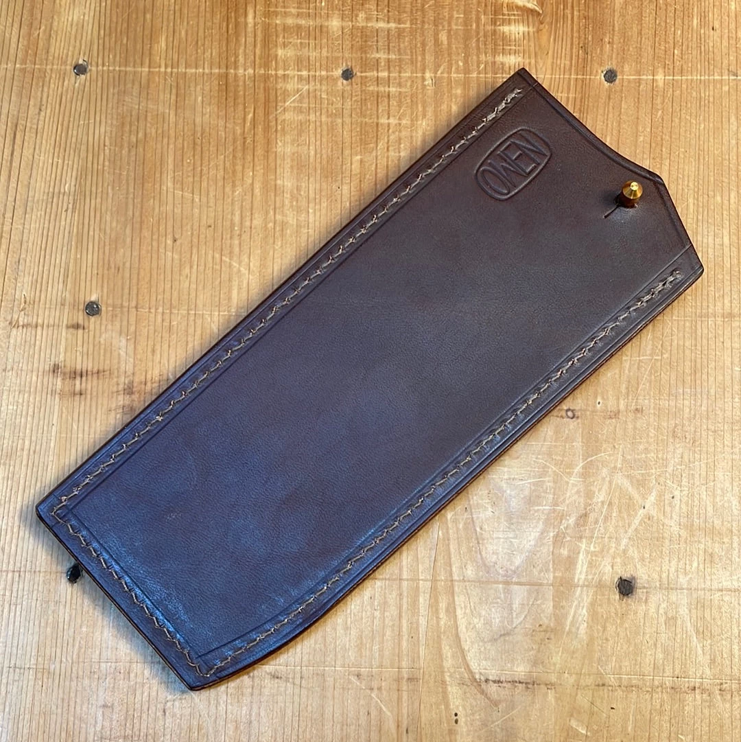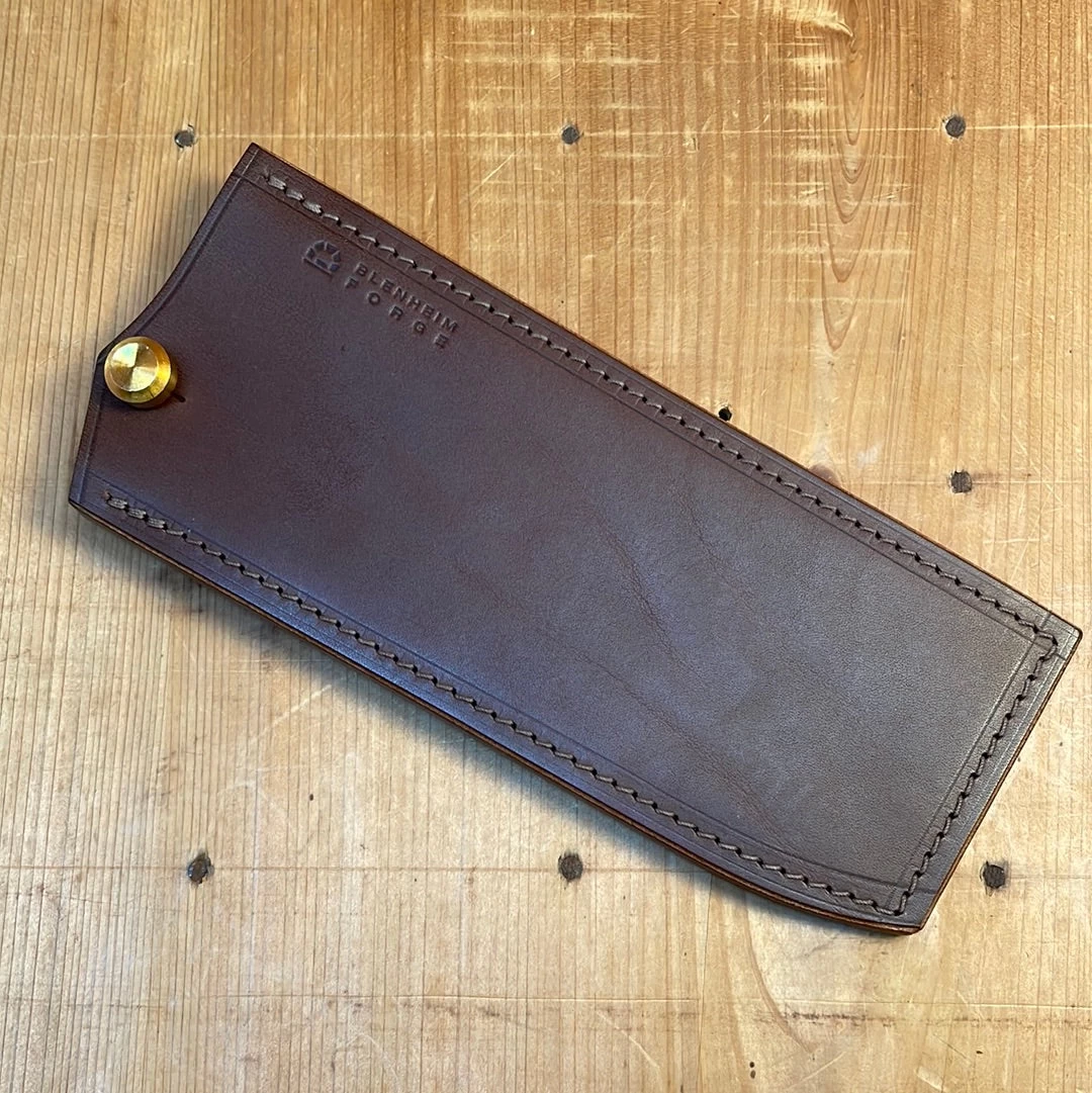 Mid brown Italian vegetable tanned leather sheath for Blenheim Forge Classic Range Nakiri handcrafted by Harry Owen of Owen Leather in Peckham London.