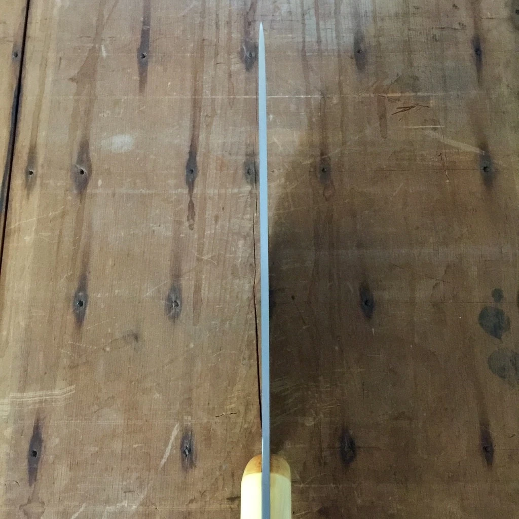 Carbon steel will develop a patina with use, especially with acidic foods. Special attention is needed to keep from rusting. Do not leave wet. Hand wash & dry, no dishwasher. Hardwood-end grain or softwood long grain cutting boards are preferred; avoid bamboo and plastic cutting boards. Rust can be removed with a light abrasive.