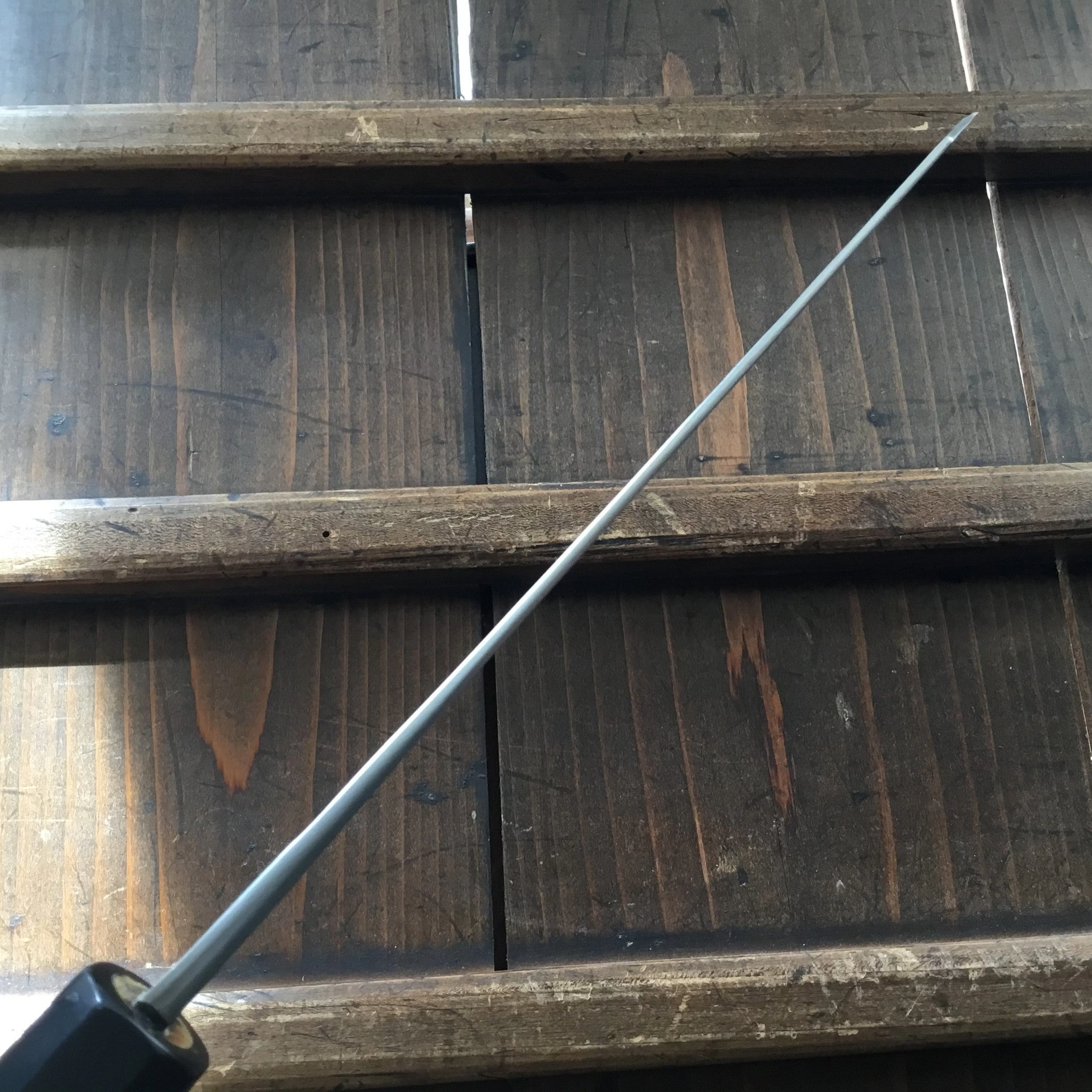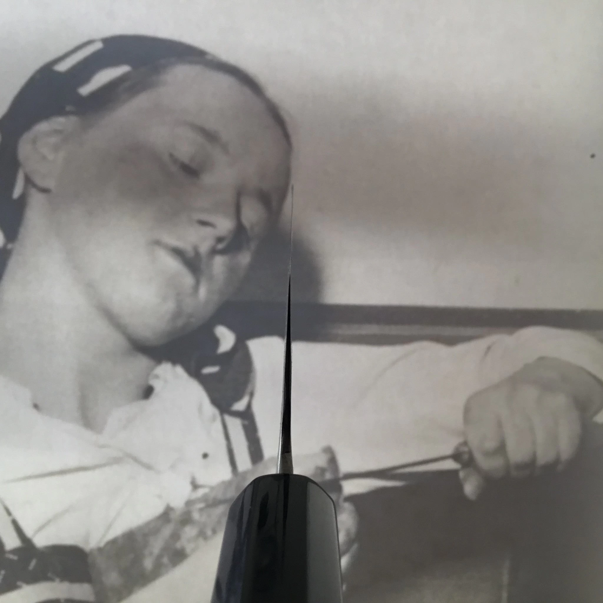 Forged and ground thin for smooth cutting and easy sharpening but with a stiff substantial feel and generous height and a full belly. Aogami #2 steel, made by Hitachi, has the lowest carbon content of the Aogami family, giving a little more toughness. The stainless cladding has nashiji (pearskin) finish. The aogami core is not stainless (for a non-stainless steel it does rust slowly), so keep dry when not in use to avoid rust.