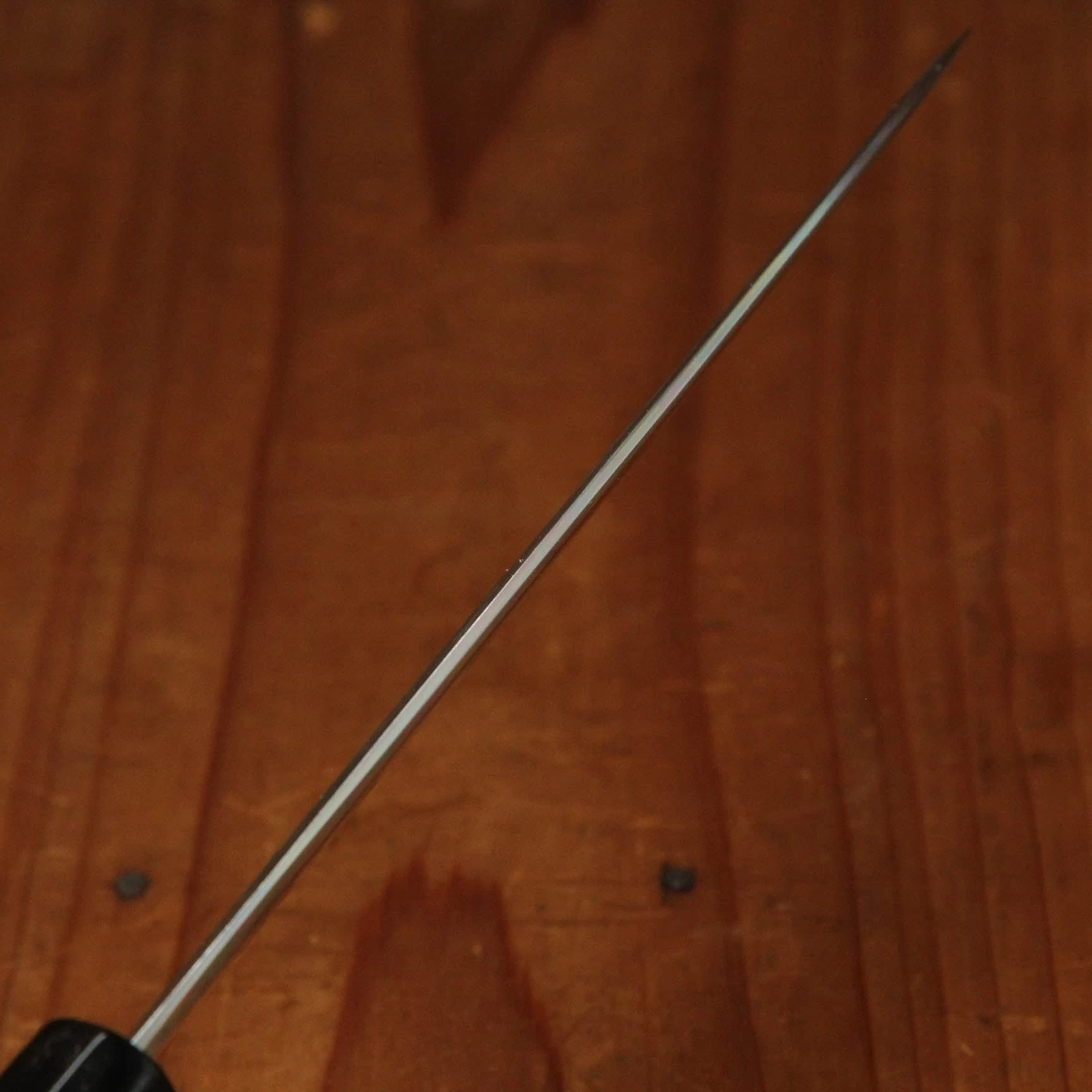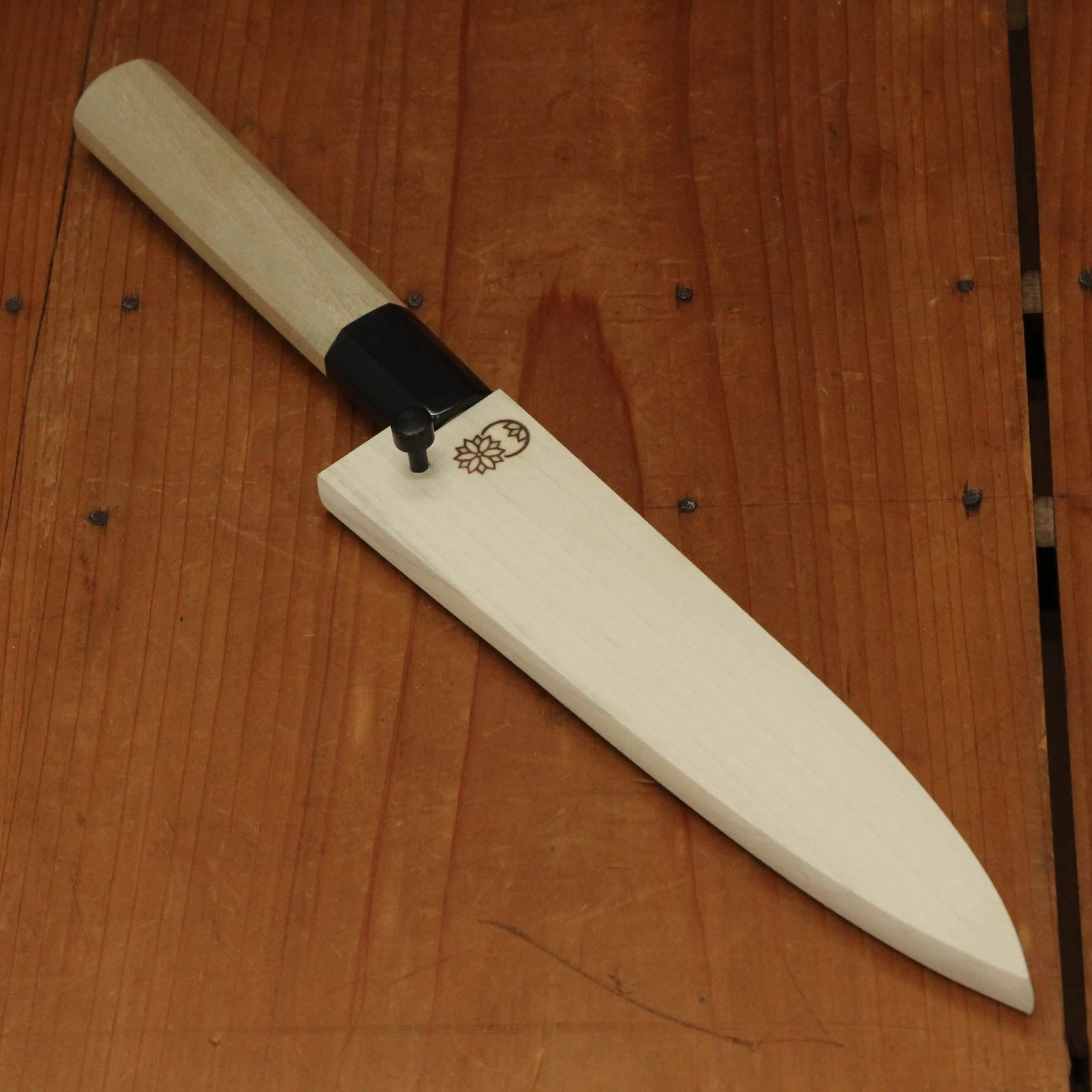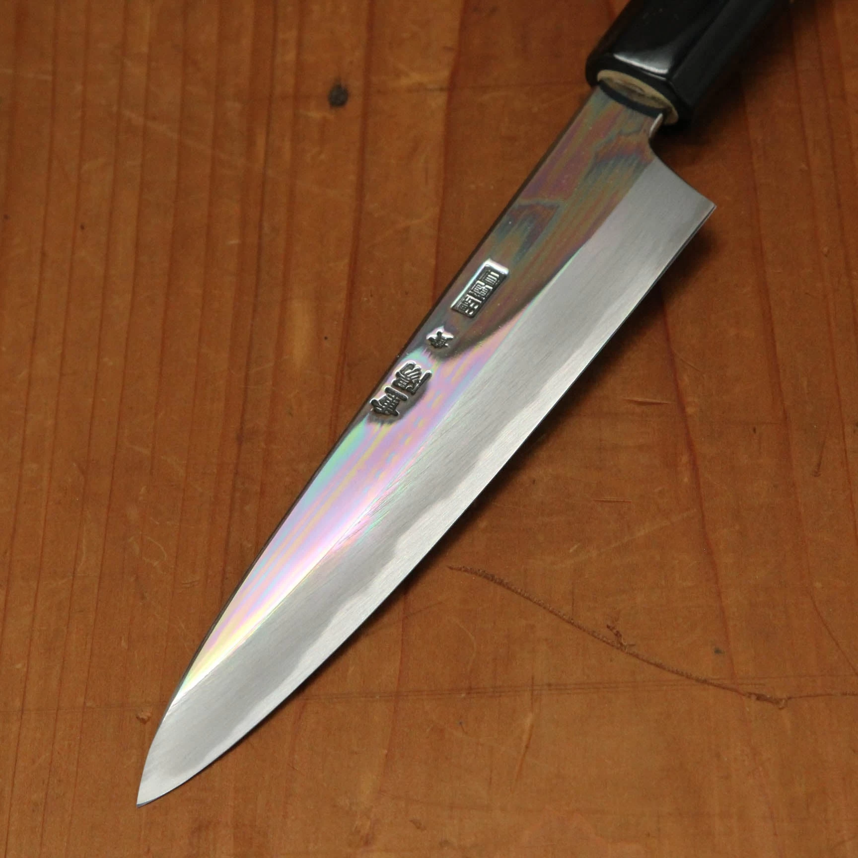 Sakai Kikumori ‘Choyo’ 150mm petty. Double bevel aogami #1 core with mirror polish iron cladding. Octagonal magnolia wood and water buffalo ferrule handle. Comes with saya.