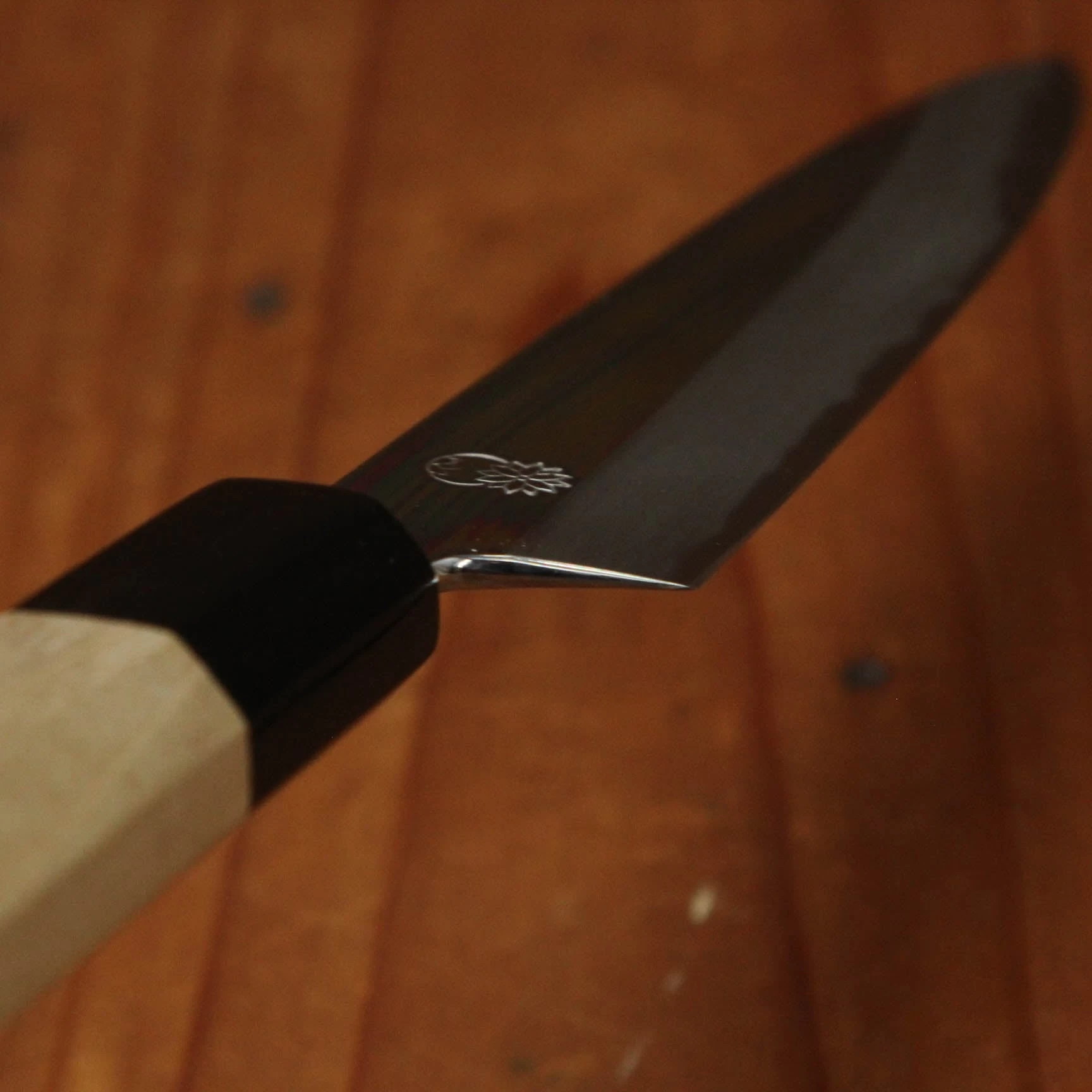 Choyo Aogami 1 knives are forged by Tanaka Hamono. Tanaka-san’s top level forging and heat treatments make for unusually easy sharpening, superb edge life and toughness.