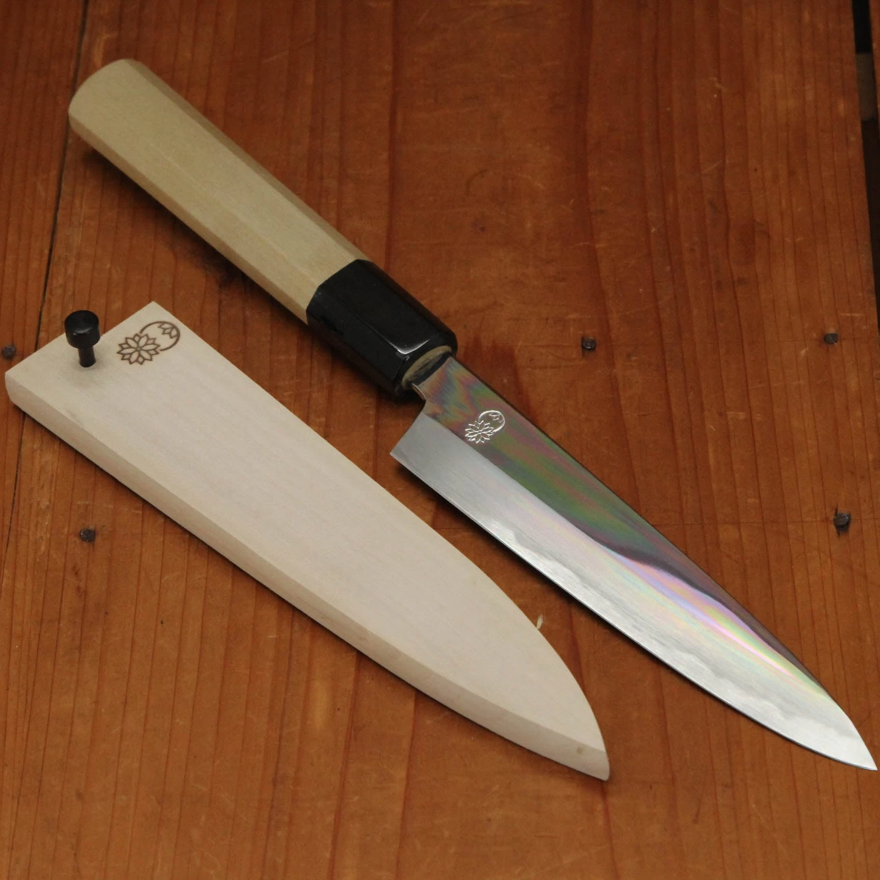 Sakai Kikumori ‘Choyo’ 150mm Kiritsuke Petty. Double bevel shirogami #2 core with mirror polish iron cladding. Octagonal magnolia wood and water buffalo ferrule handle. Comes with saya.