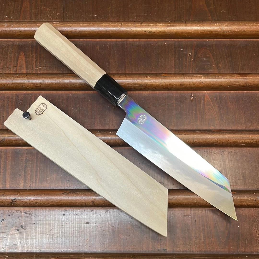 Sakai Kikumori ‘Choyo’ 180mm Kiritsuke Santoku. Double bevel aogami #1 core with mirror polish iron cladding. Octagonal magnolia wood and water buffalo ferrule handle. Comes with saya.