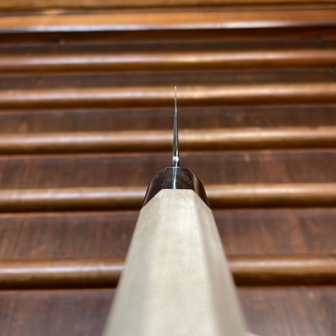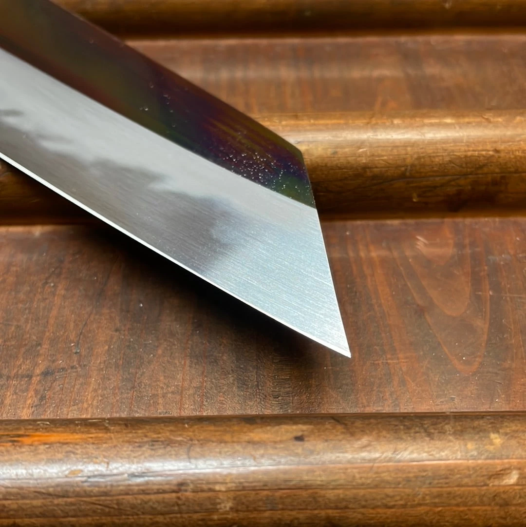 Choyo grinder and polisher is Morihiro Hamono. Morihiro-san’s grinding is superb; he pioneered this type of low kiriba grind on wa-gyuto. The characteristic result of this grinding and polishing are the even, wide bevels, chamfered spine and brilliant mirror polish.