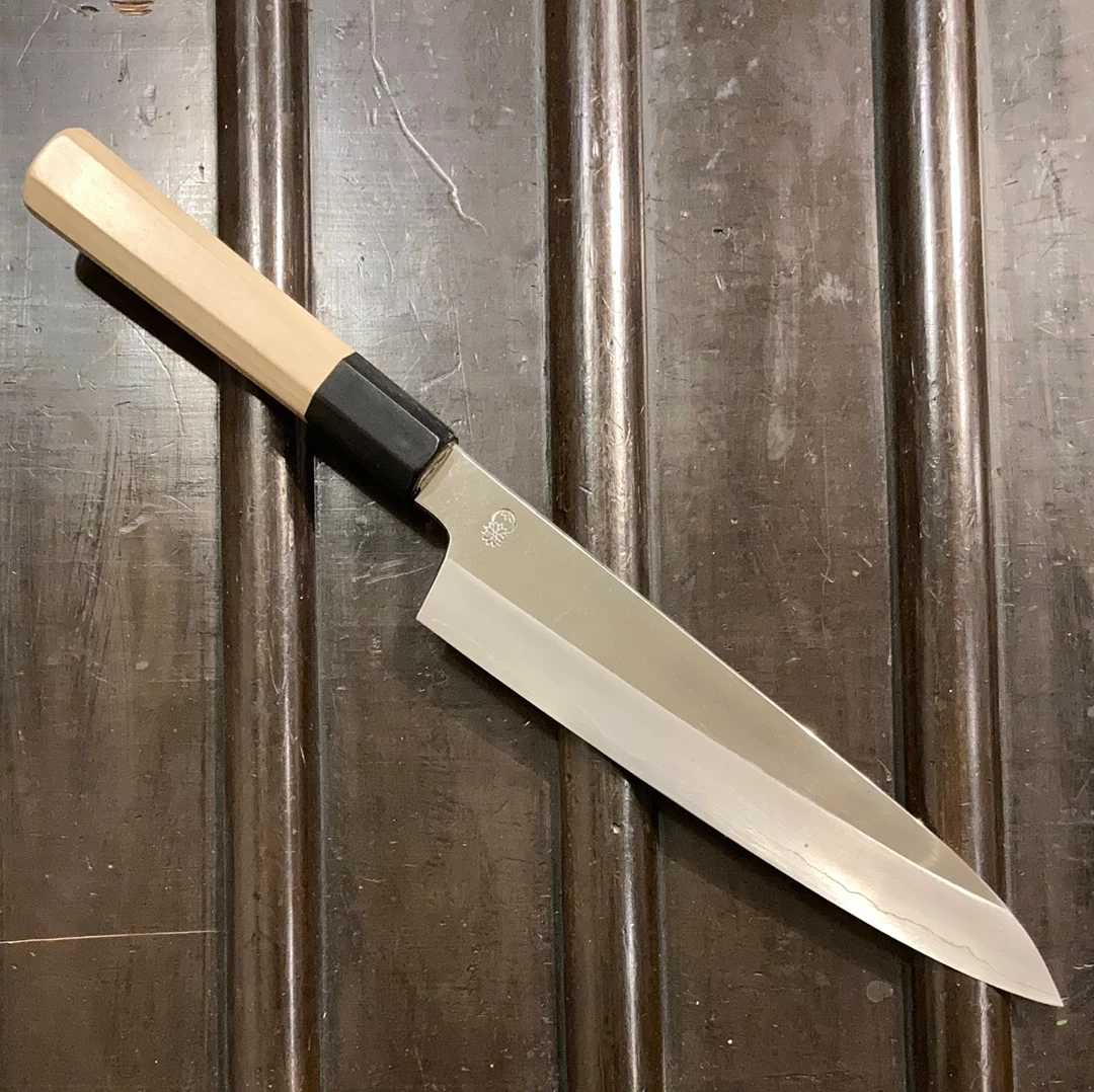 Sakai Kikumori ‘Choyo’ 210mm gyuto. Double bevel ginsanko stainless core with mirror polish stainless cladding. Octagonal magnolia wood and water buffalo ferrule handle. Comes with saya.