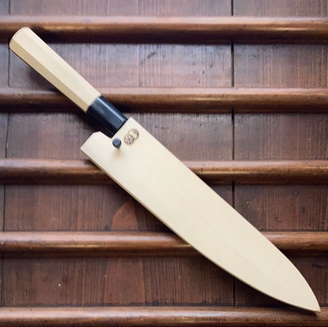 Sakai Kikumori ‘Choyo’ 210mm Gyuto. Double bevel shirogami #2 core with mirror polish iron cladding. Octagonal magnolia wood and water buffalo ferrule handle. Comes with saya.