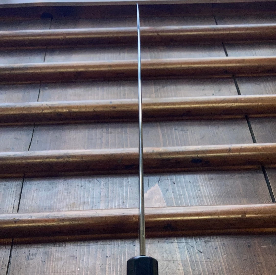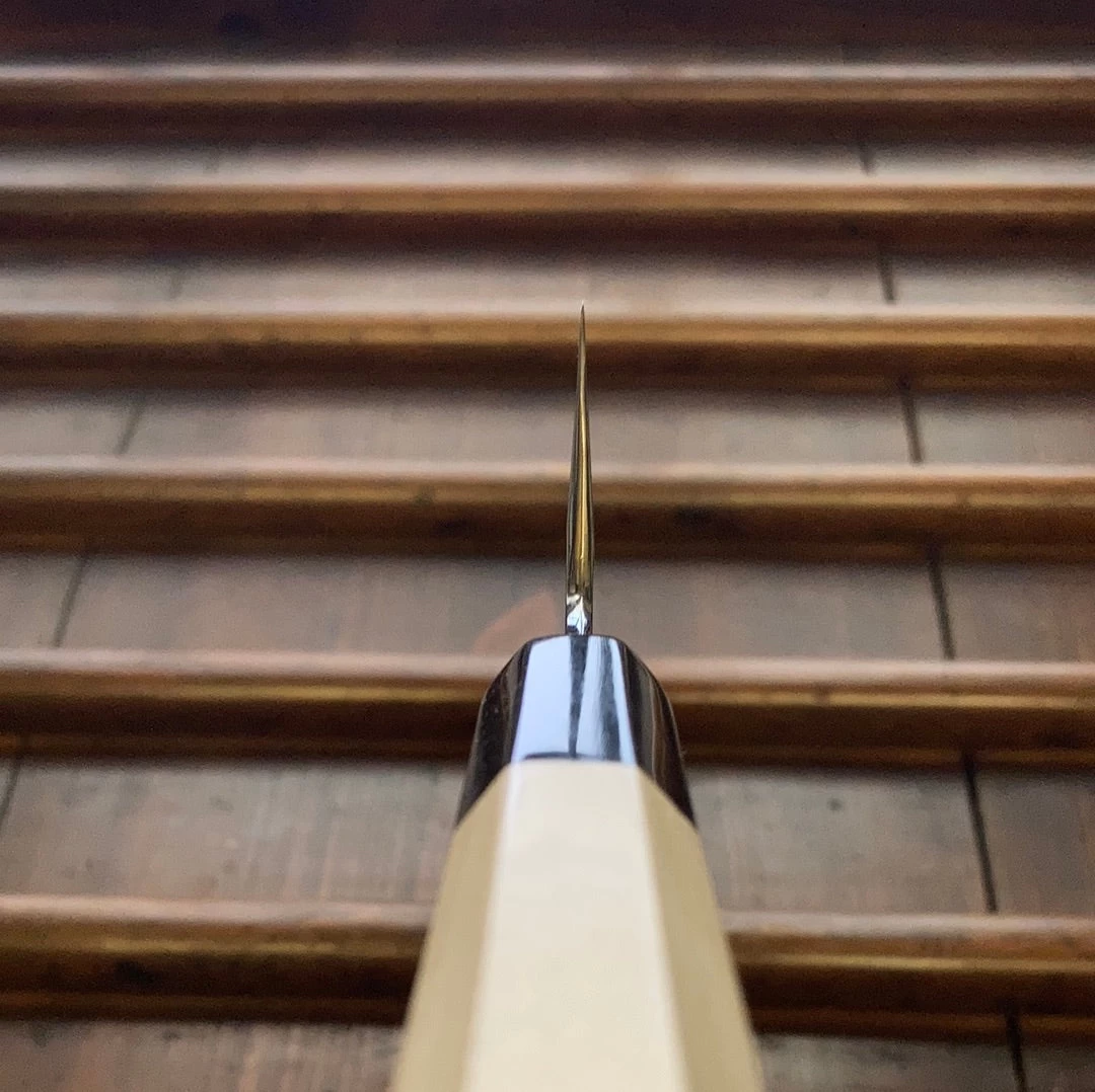 Choyo grinder and polisher is Morihiro Hamono. Morihiro-san’s grinding is superb; he pioneered this low kiriba grind on wa-gyuto. The characteristic result of this grinding and polishing are the even, wide bevels, chamfered spine and brilliant mirror polish.