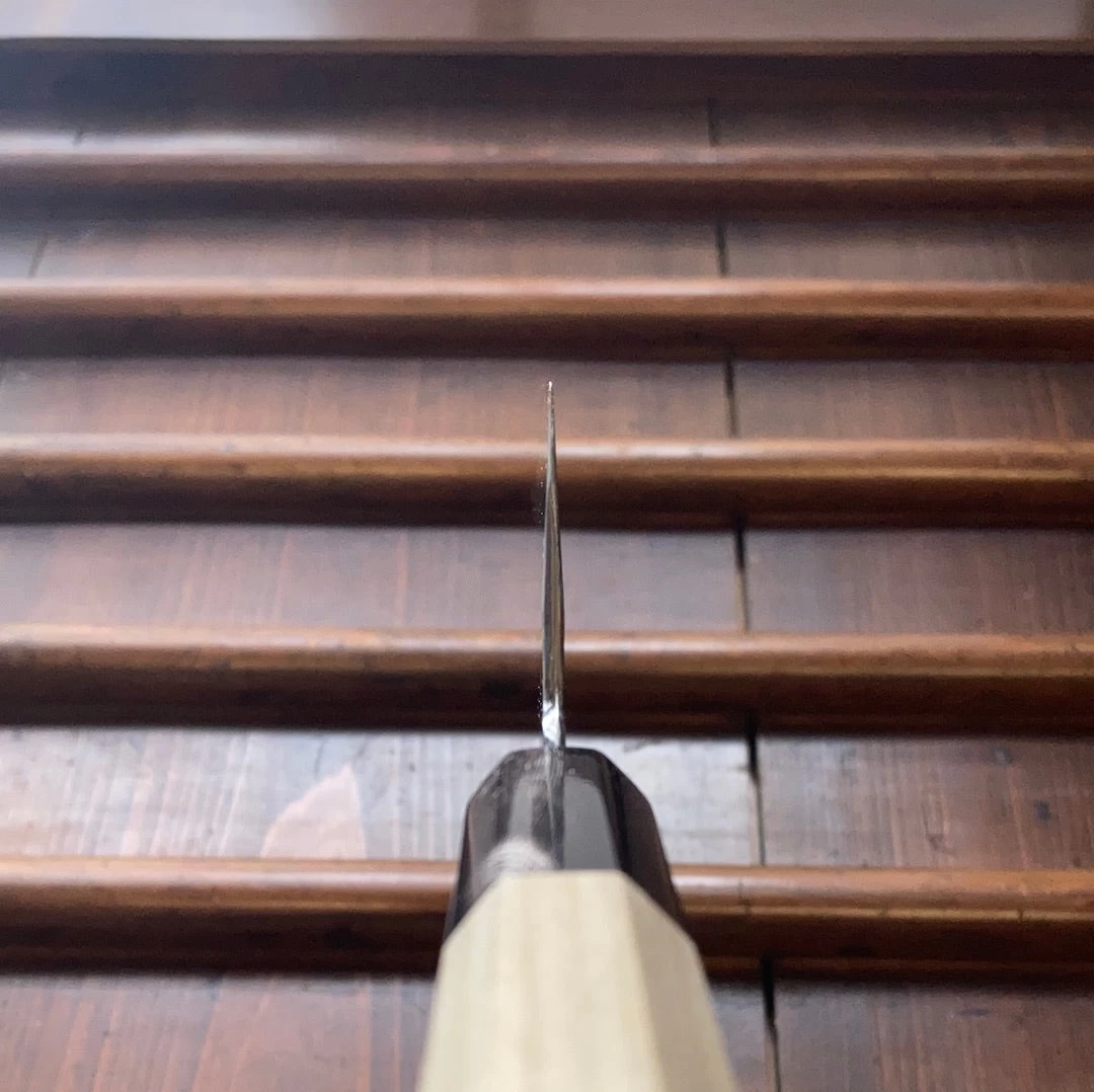 Choyo grinder and polisher is Morihiro Hamono. Morihiro-san’s grinding is superb; he pioneered this low kiriba grind on wa-gyuto. The characteristic result of this grinding and polishing are the even, wide bevels, chamfered spine and brilliant mirror polish.
