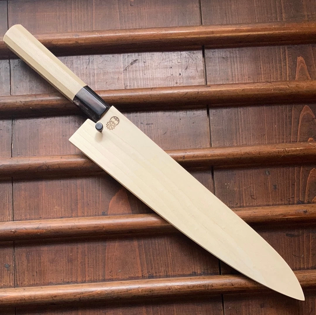 Sakai Kikumori ‘Choyo’ 240mm Gyuto. Double bevel shirogami #2 core with mirror polish iron cladding. Octagonal magnolia wood and water buffalo ferrule handle. Comes with saya.