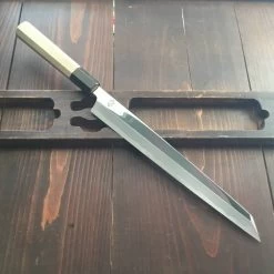 These have a light blade with a thin, low beveled kireba so the yanagis — that usually rely on weight to help propel a pull cut — slice just as easily as heavier ones.