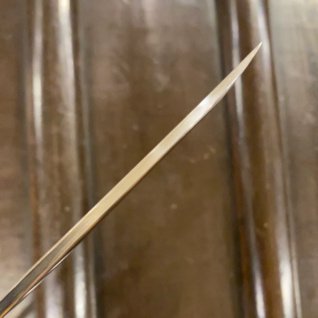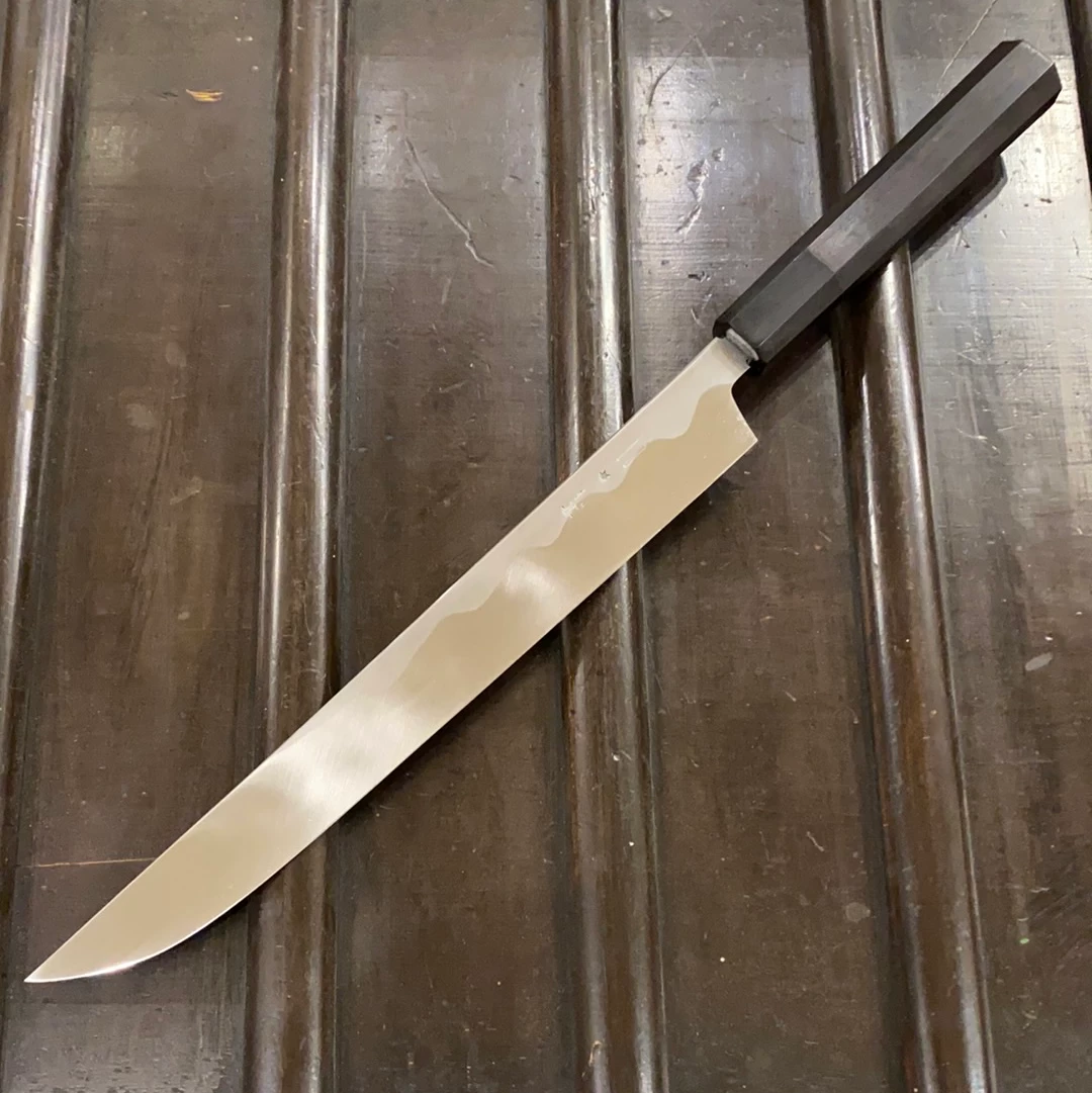 Sakai Kikumori ‘Choyo’ 270mm Saber-tip Sakimaru Takobiki. Single bevel aogami #1 core blade with mirror polish iron cladding. Octagonal ebony wood and water buffalo ferrule handle.