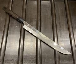 Sakai Kikumori ‘Choyo’ 300mm Saber Tip Sakimaru Takobiki. Single bevel aogami #1 core blade with mirror polish iron cladding. Octagonal ebony wood and water buffalo ferrule handle. Comes with saya.