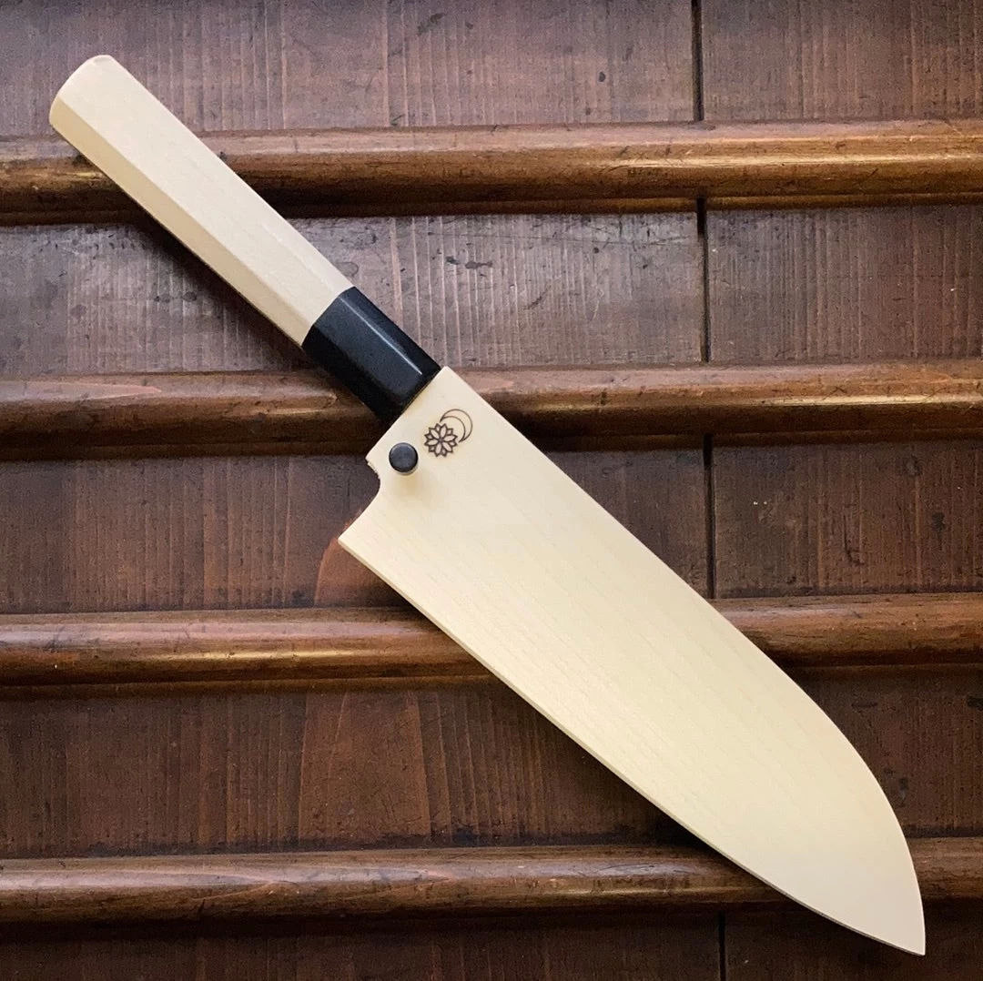 Sakai Kikumori ‘Kikuzuki Kasumi’ 180mm Santoku. Double bevel shirogami #2 core blade with iron cladding. Octagonal magnolia wood and water buffalo ferrule handle. Comes with saya.