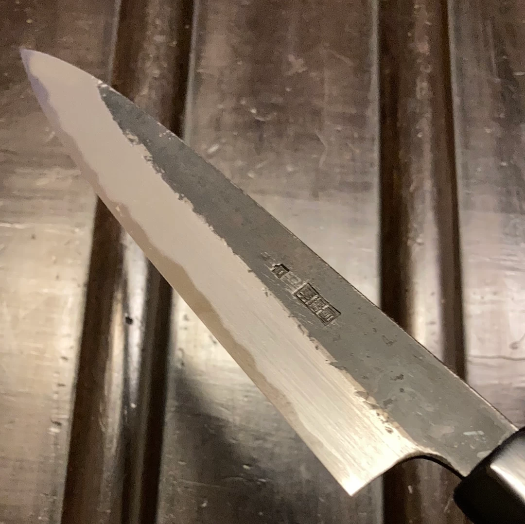 Sakai Kikumori Kikuzuki Kuro’ 150mm Petty. Double bevel shirogami #2 core blade with kurouchi iron cladding. Octagonal magnolia wood and water buffalo ferrule handle.