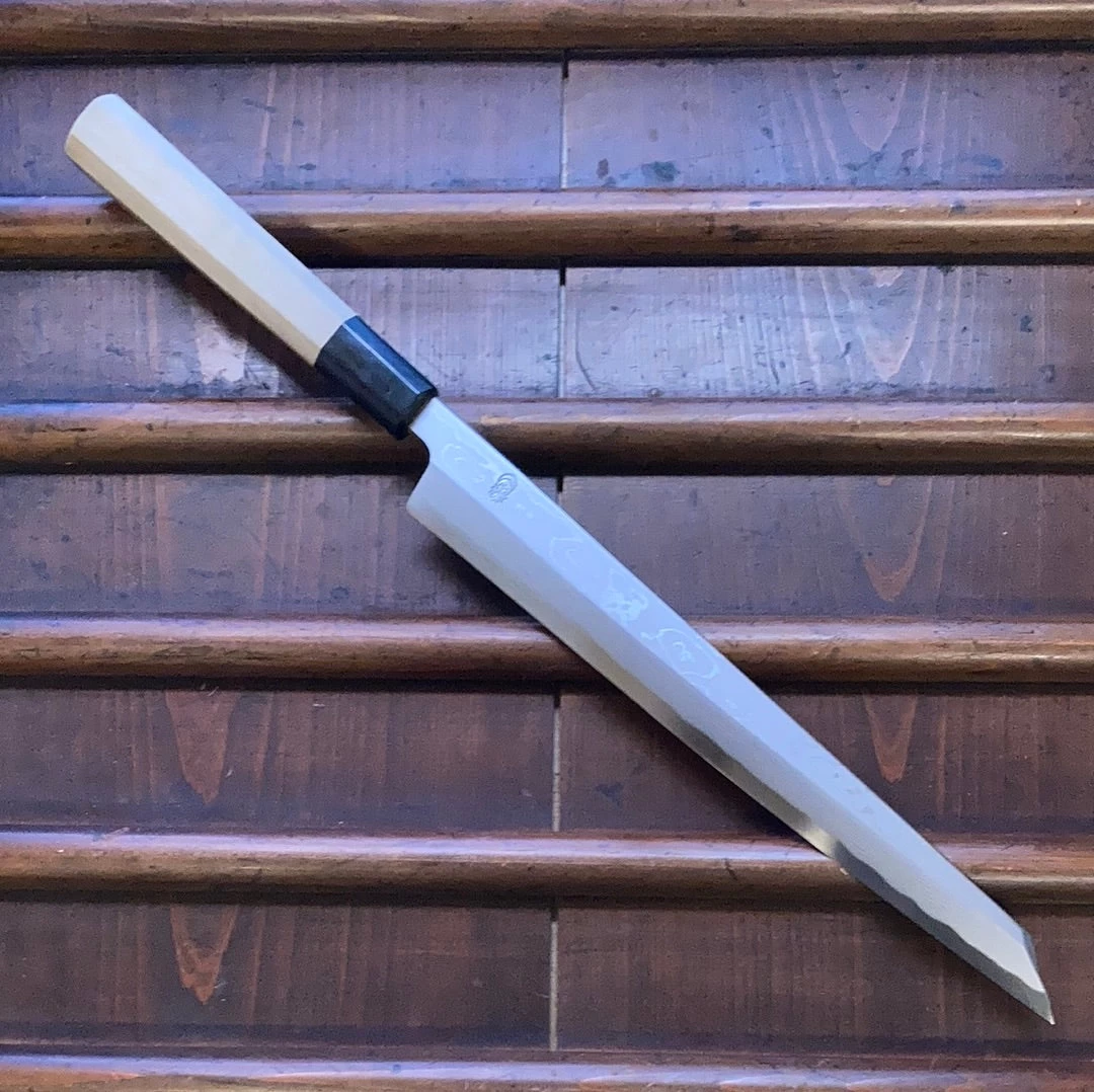 Sakai Kikumori Kikuzuki Uzu’ 270mm Kiritsuke Yanagi. Single bevel aogami #1 core blade with damascus iron cladding. Octagonal magnolia wood and water buffalo ferrule handle. Comes with saya.