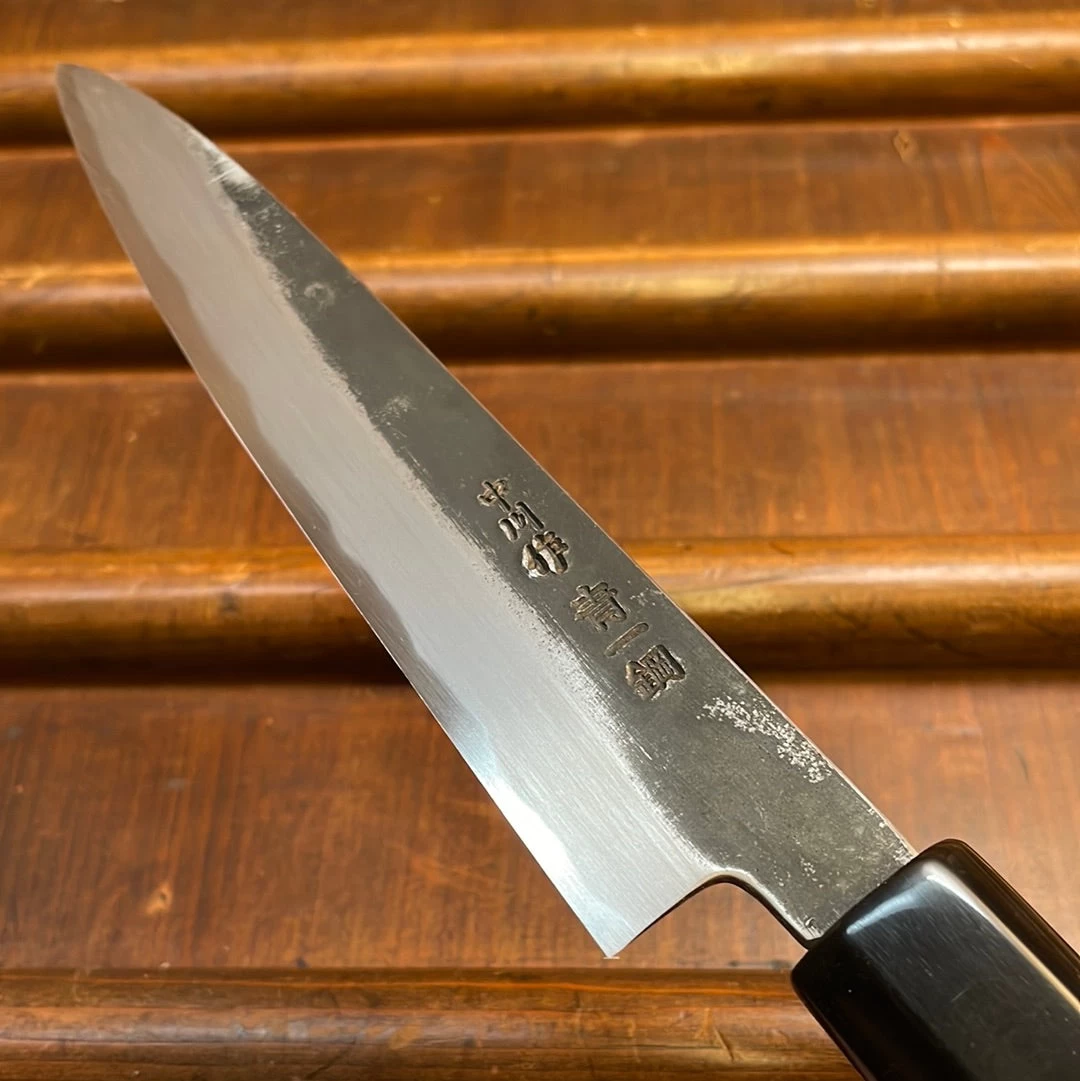 Aogami 1 is a low contaminate carbon steel with tungsten as a main alloy ingredient. Sometimes, Aogami 1 is overshadowed by its sibling, aogami super, which has a higher alloy content that includes vanadium for long edge life. However, aogami 1 has better edge formation and typically works better at finer finishes than the busier aogami super. Nakagawa-san’s aogami 1 has a nice blend of edge life, toughness for a hard steel and most of all, excellent edge formation. Nakagawa-san’s aogami 1 has a bitey feeling even at finer finishes that can often leave aogami steels feeling sterile or slidey. Nakagawa’s aogami 1 also works very nicely with a variety of natural stones.