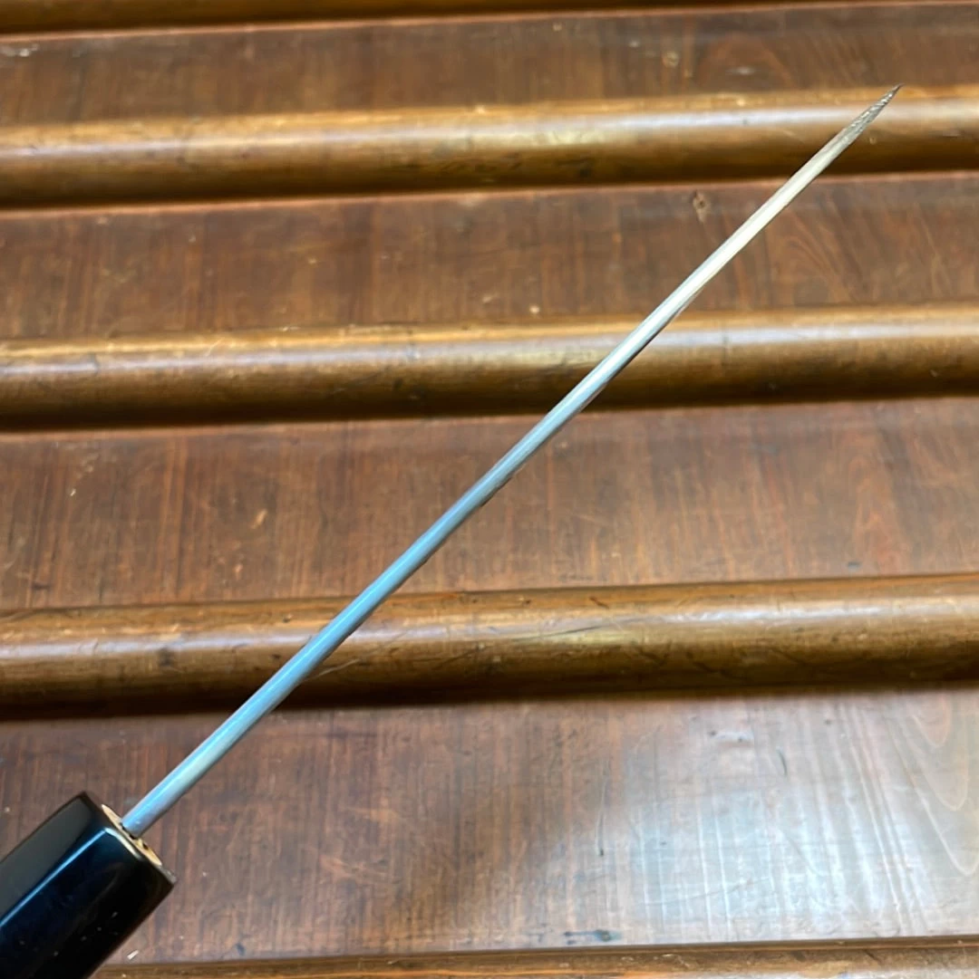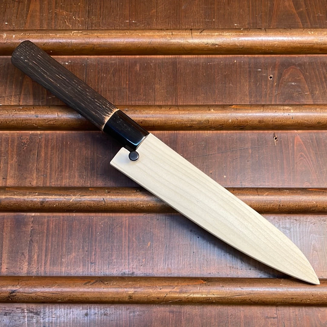 These knives represent a blend of the rustic and the refined. They have a dark forge-scale ‘kurouchi’ finish and exceptionally thin grinds to support the superb forging. Nakagawa-san’s smithing is characterized by thorough heat treatment with excellent heat control during forging. The result are knives that have remarkable edge formation and edge retention while remaining tough.