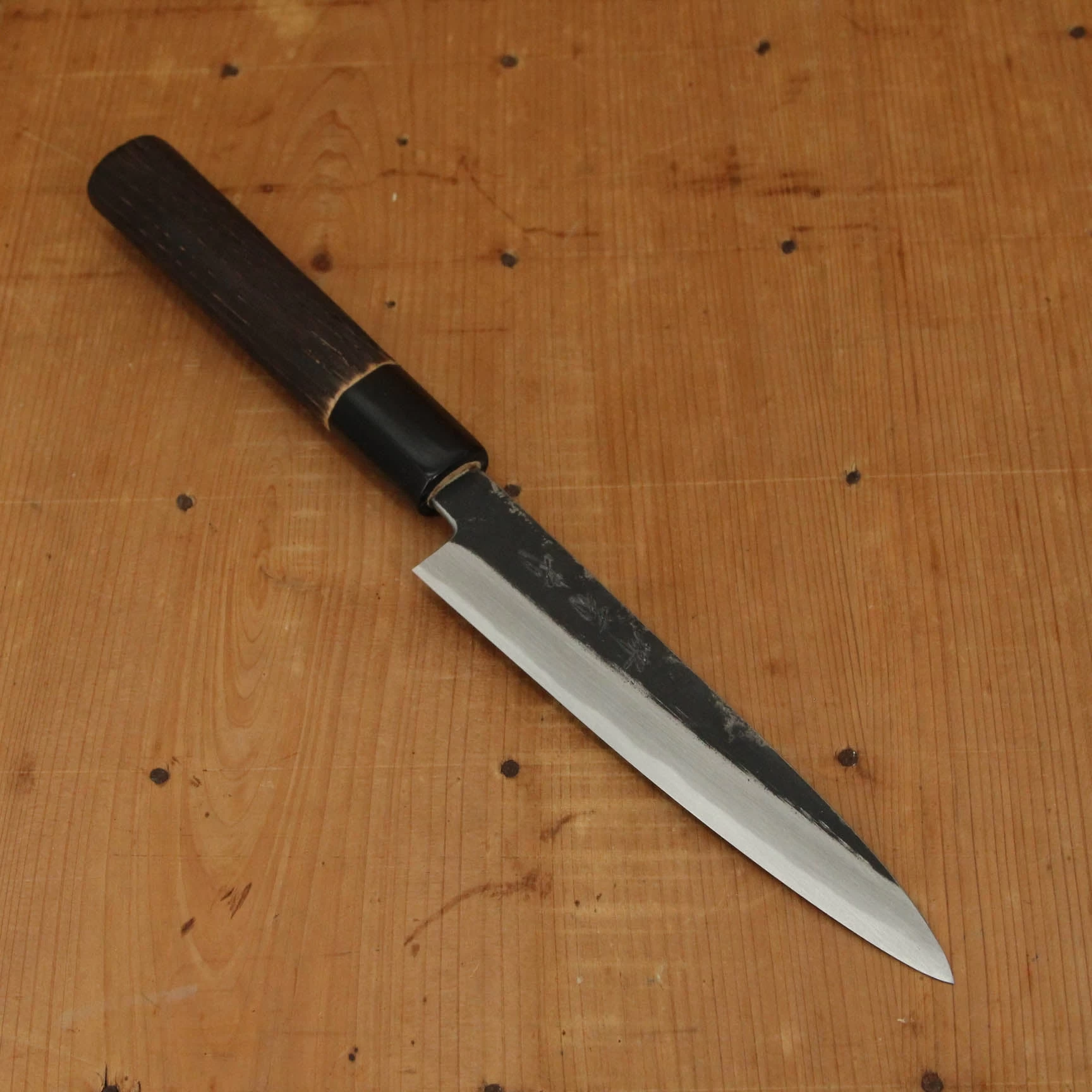 Sakai Kikumori Nakagawa 150mm Petty Aogami 1 Kurouchi Burnt Chestnut w/ Saya – utility use small enough to do some handheld work but longer enough to process on a cutting board.