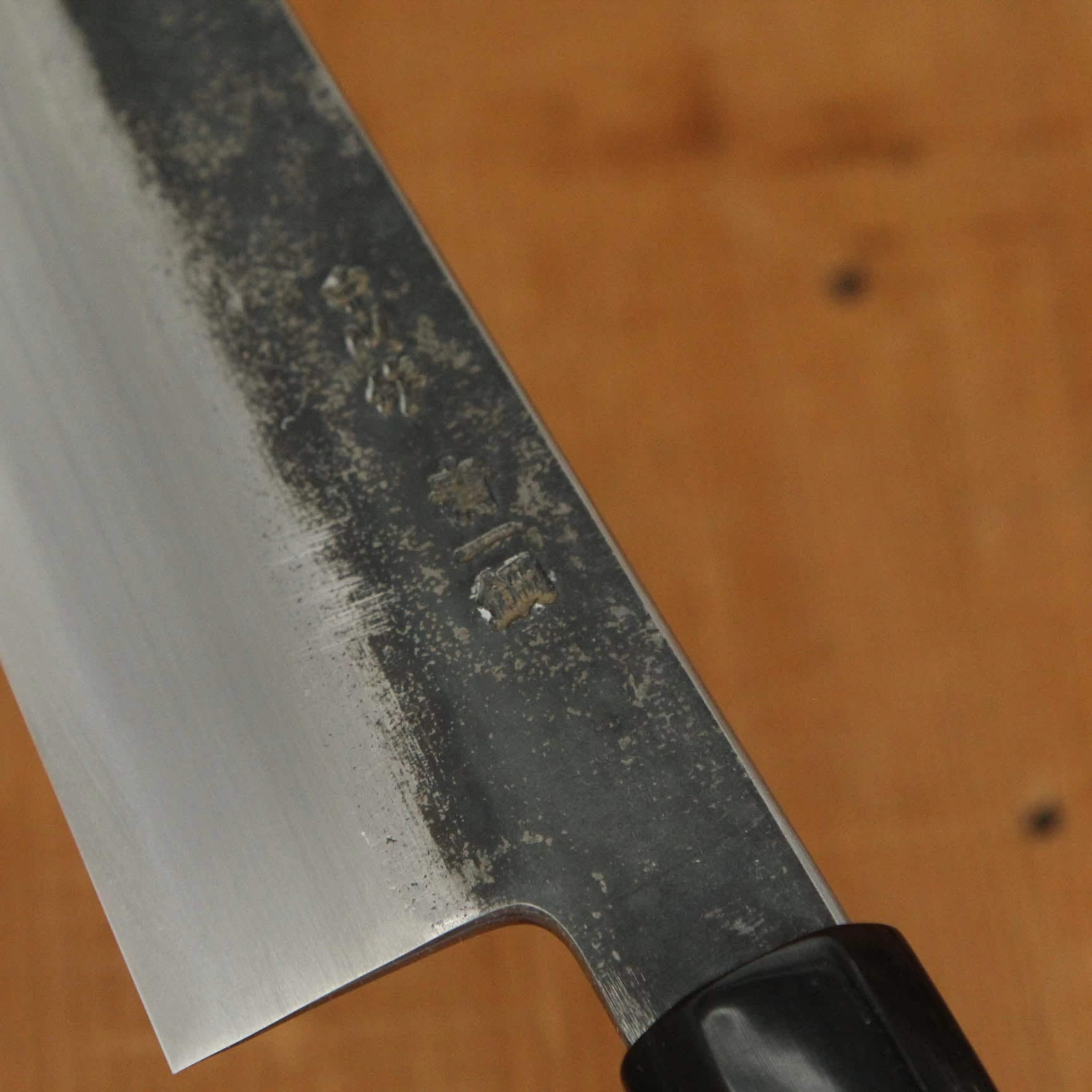 This knife has a hard carbon steel core with iron cladding for added durability. The entire blade will develop a patina with use, especially with acidic foods. Special attention is needed to keep the blade from rusting. Do not leave wet; hand wash & dry. Never use a dishwasher. Rust can be removed using a light abrasive. Hardwood end-grain or softwood long-grain cutting boards are preferred; avoid bamboo and plastic cutting boards to reduce edge damage.