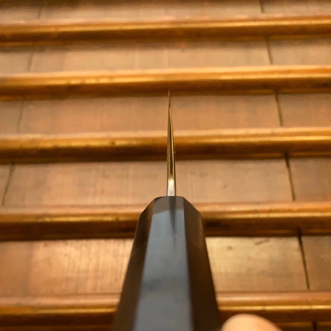 Aogami super knives usually hold an edge for a long time, but most don’t actually work well at a fine finish. Tanaka-san’s temperature control during forging, combined with thorough heat treatments make for far better edge formation than the average aogami super. There is no glassy, hard feeling during cutting or on stones.