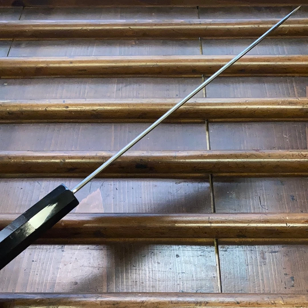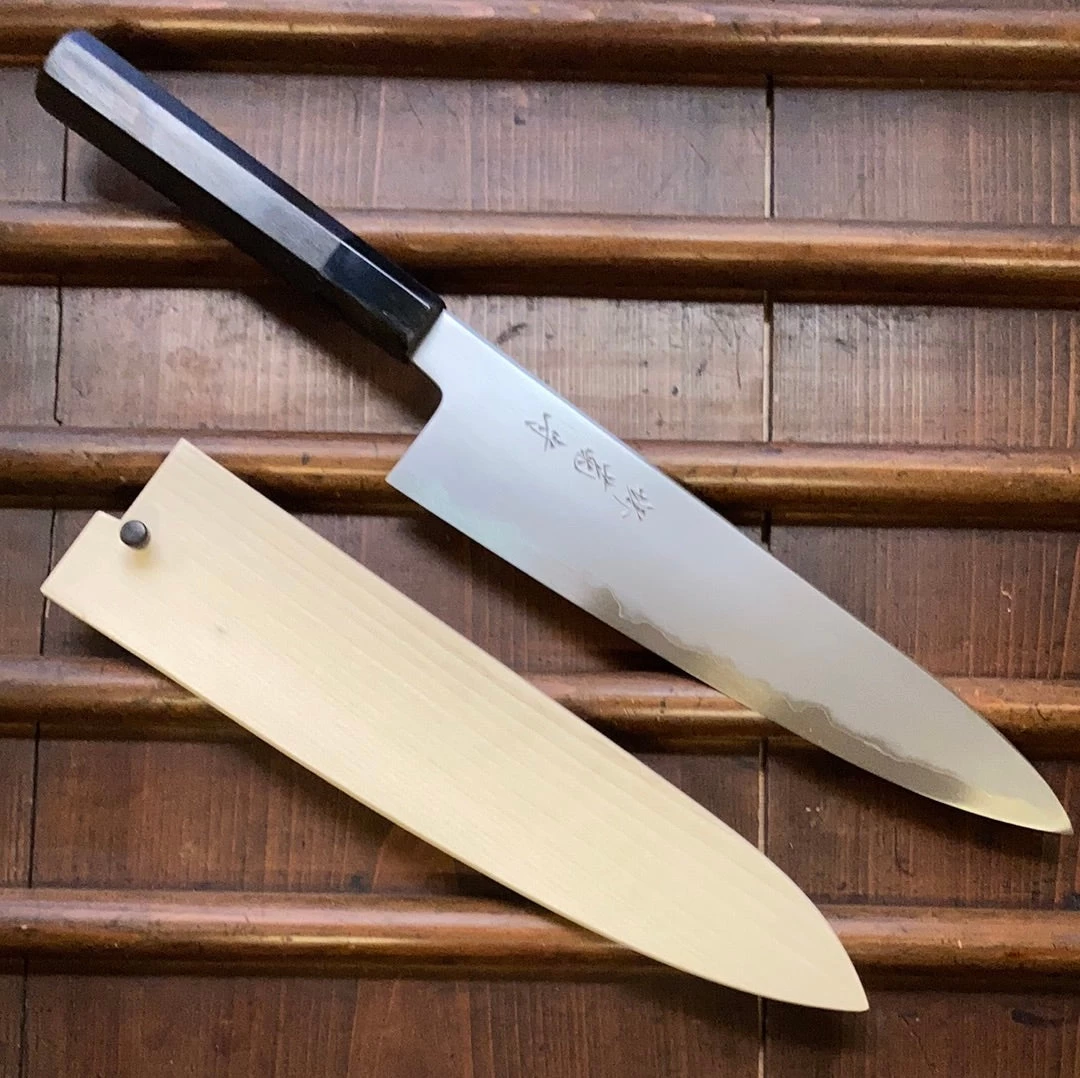 Sakai Kikumori ‘So-Ten’ 240mm Gyuto in Aogami Super. Octagonal ebony wood and water buffalo ferrule handle. Comes with saya.