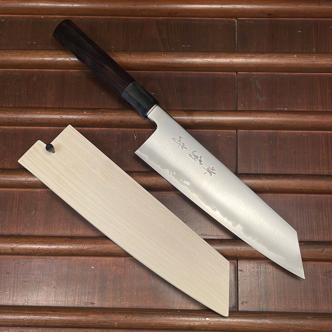 Sakai Kikumori 225mm Kiritsuke Gyuto knife. Aogami 1 carbon steel core with stainless cladding. Ebony octagon handle with buffalo horn ferrule.