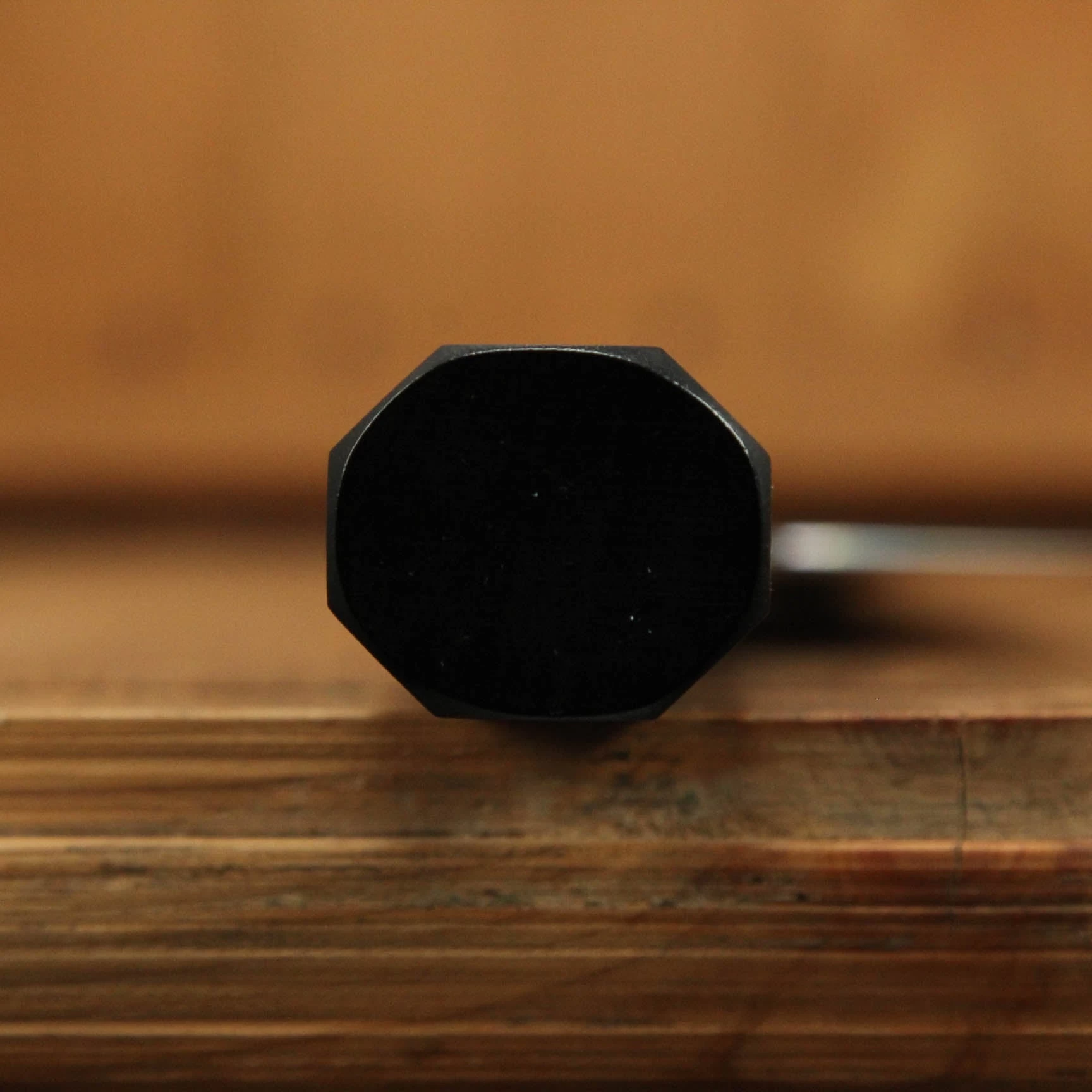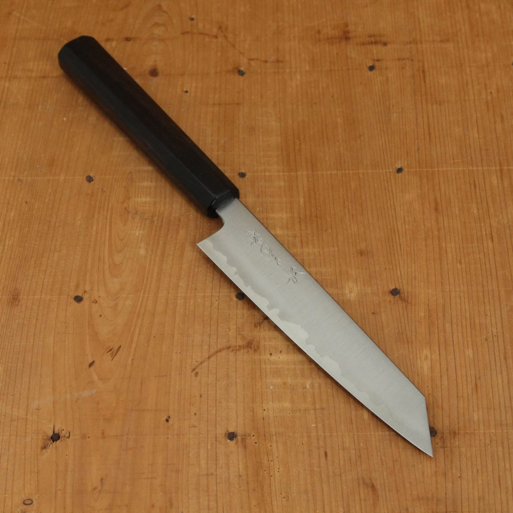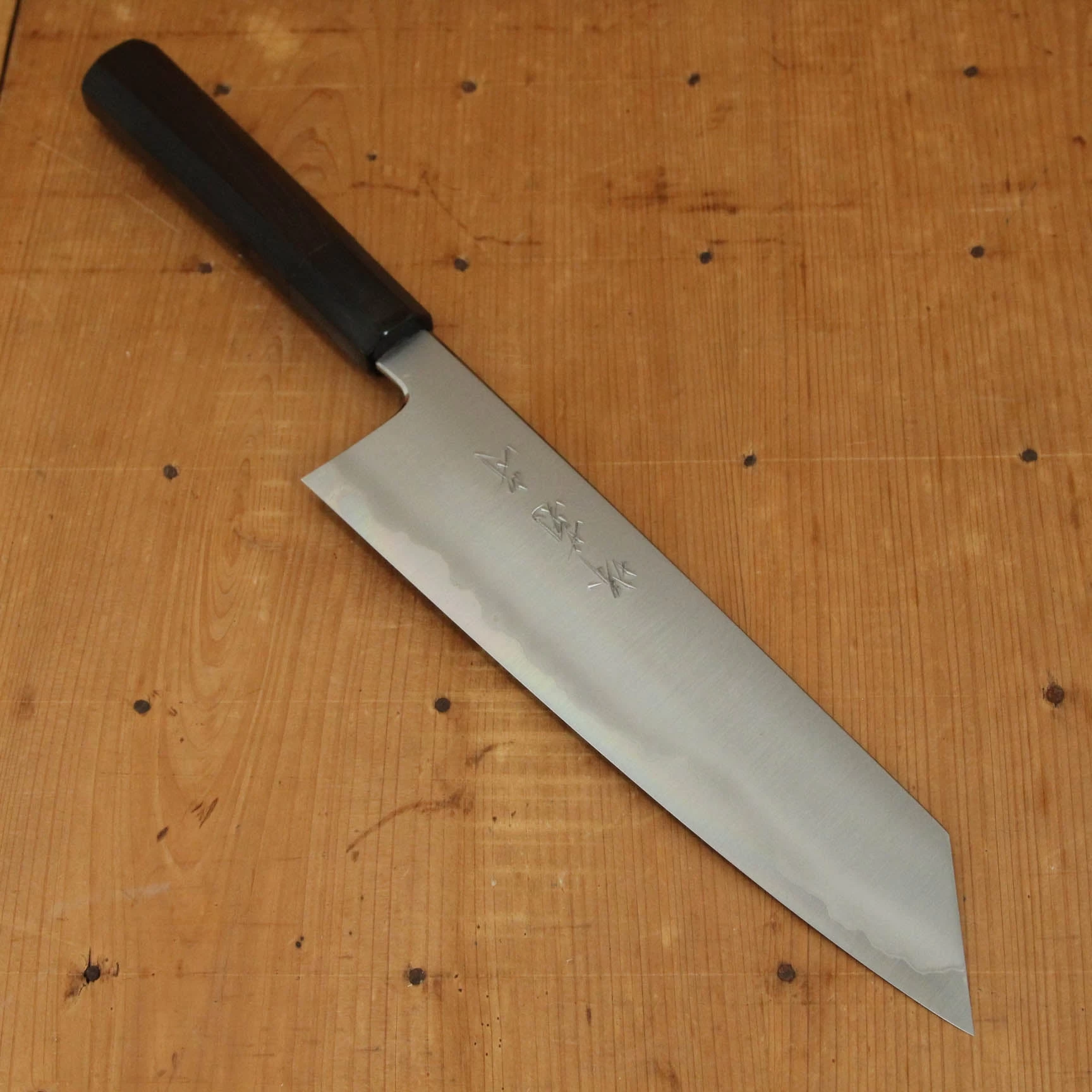 Aogami 1 carbon steel core with stainless cladding. Ebony octagon handle with buffalo horn ferrule.