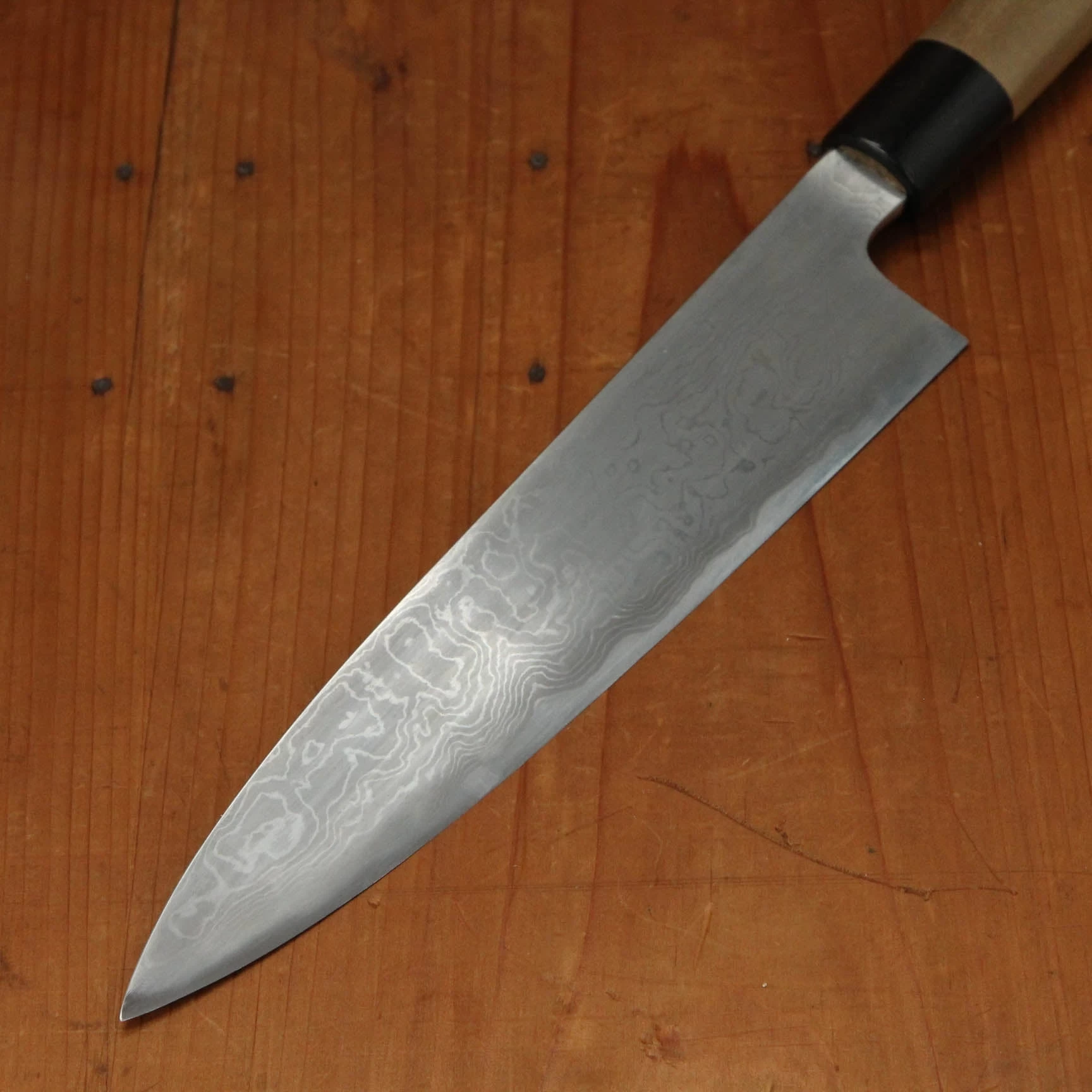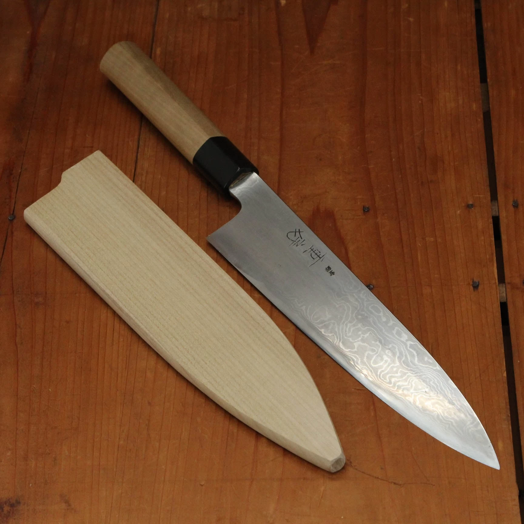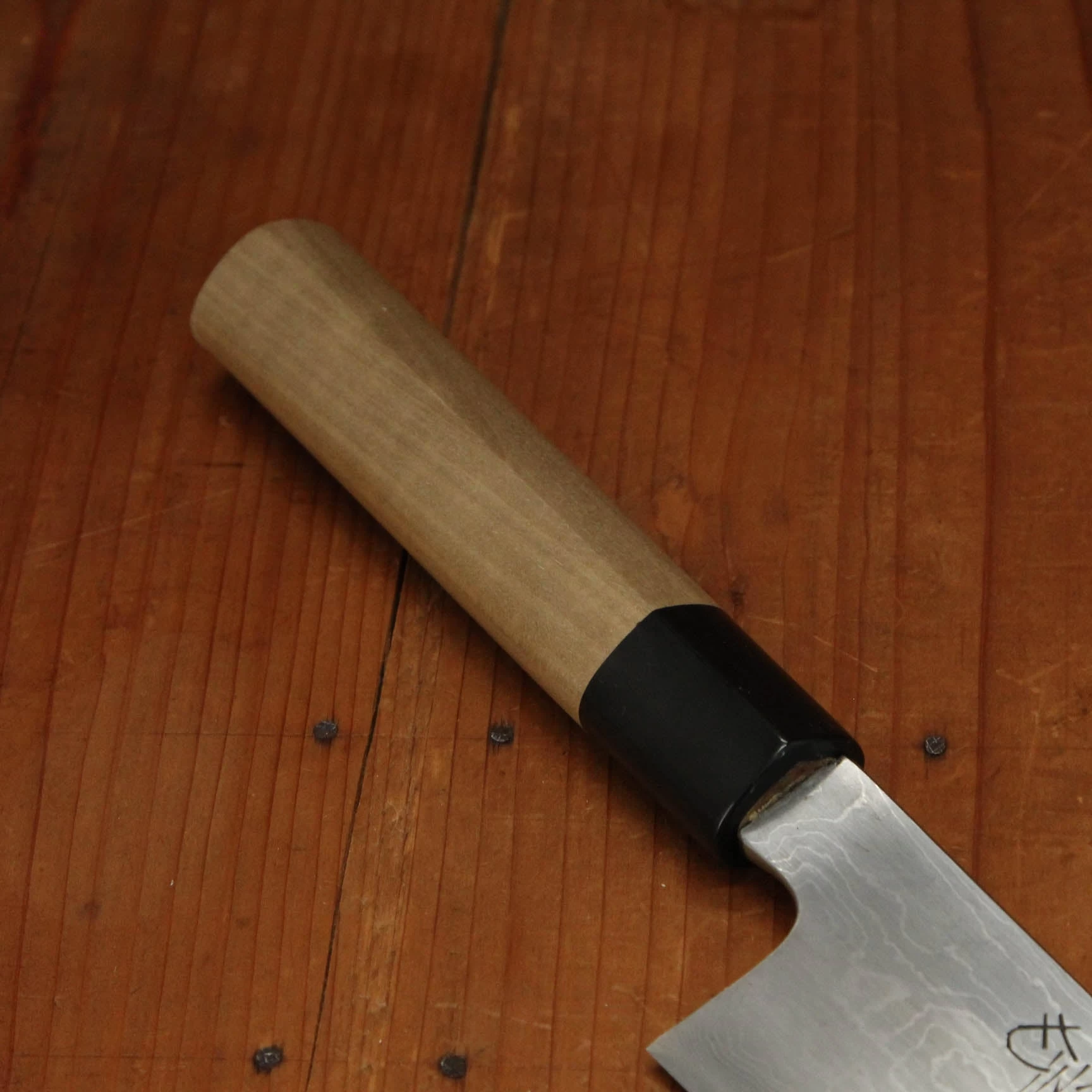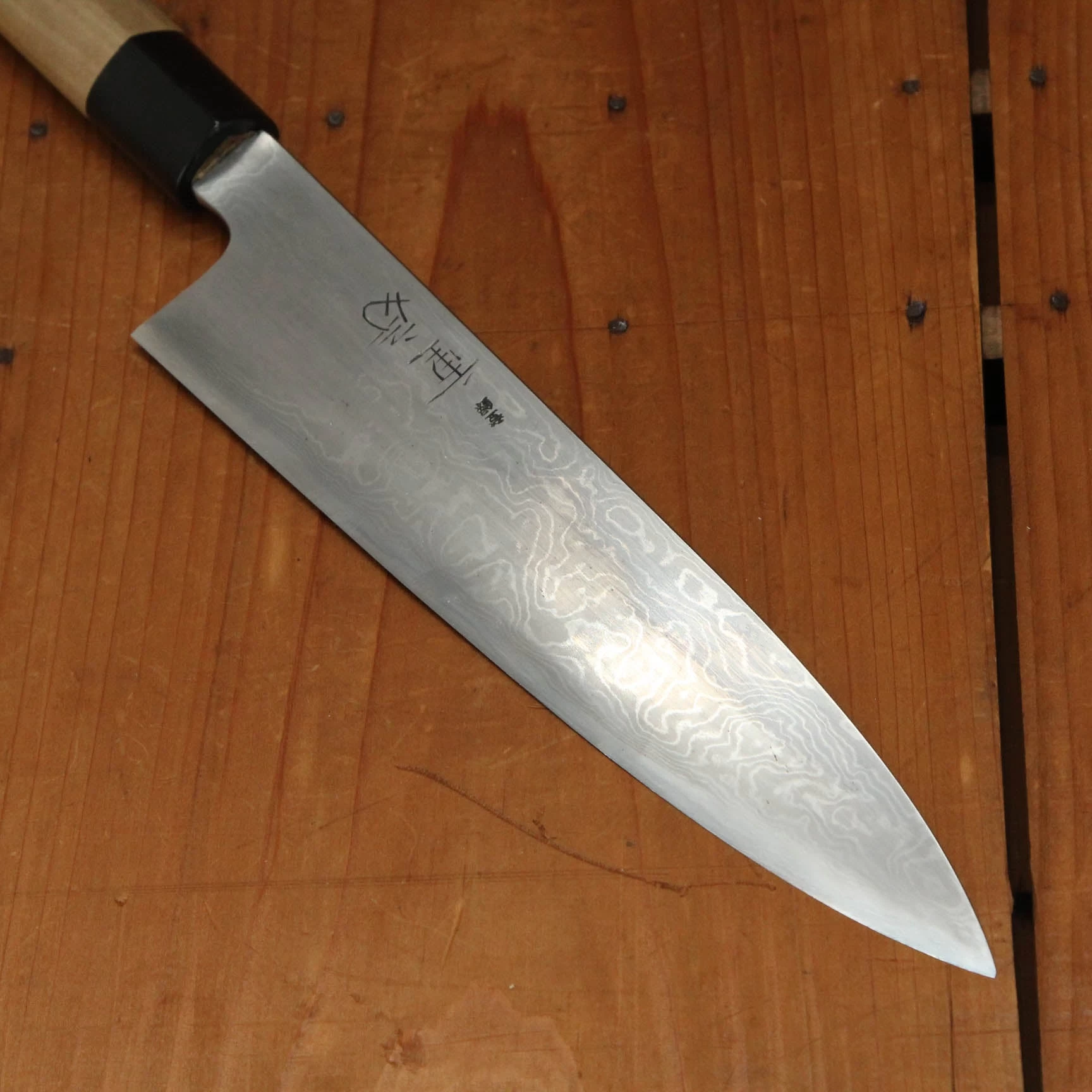 Hand forged and hand ground with traditional sen and stones in Sanjo Niigata by the Iizuka family under their Shigefusa brand. Shigefusa knives are hand forged with Swedish 26C3 ‘Spicy White’ carbon steel, a very pure high carbon steel that in the hands of the skilled Iizuka smiths makes for an incredibly fine grained steel capable of taking an amazingly fine edge while still retaining a lively, bitey feel. The cladding is a hand made free forged ‘kitaeji’ suminagashi made with iron and mild steel.