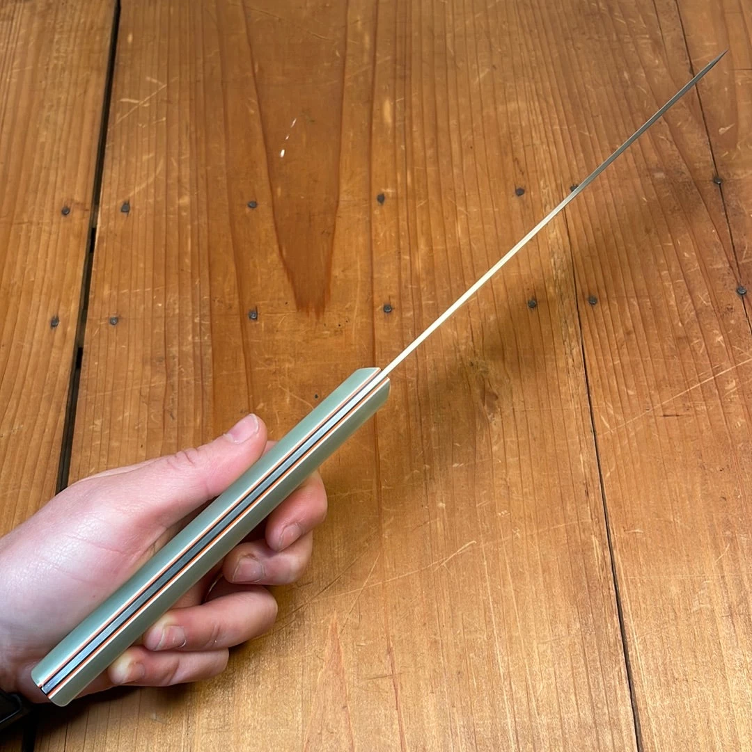 Handmade by Daniel Hilgenberg of Silverthorn Knife & Tool. The Silverthorn chef is a deep bellied chef with good amount of flat spot in the heel and a little bit of flat spot in the tip behind the kiritsuke style tip.