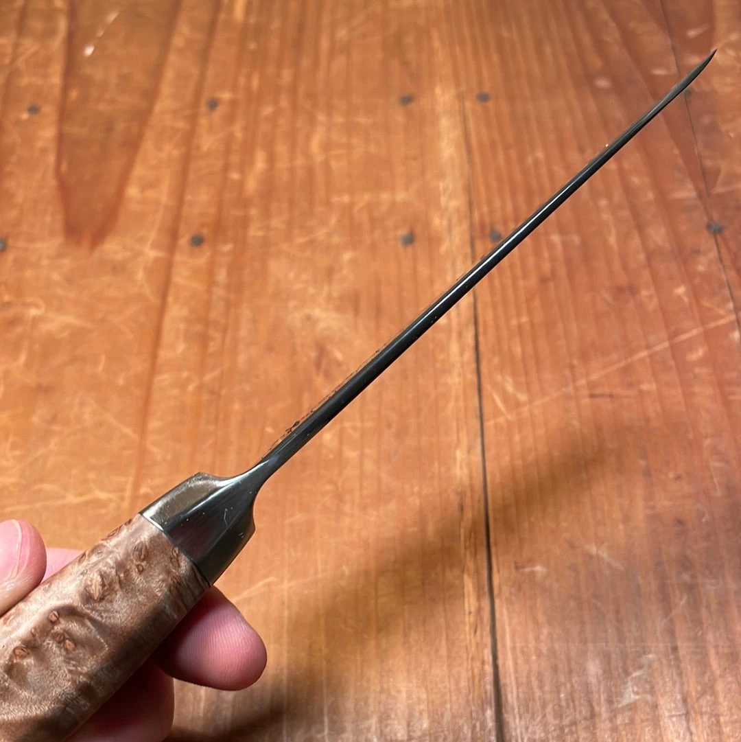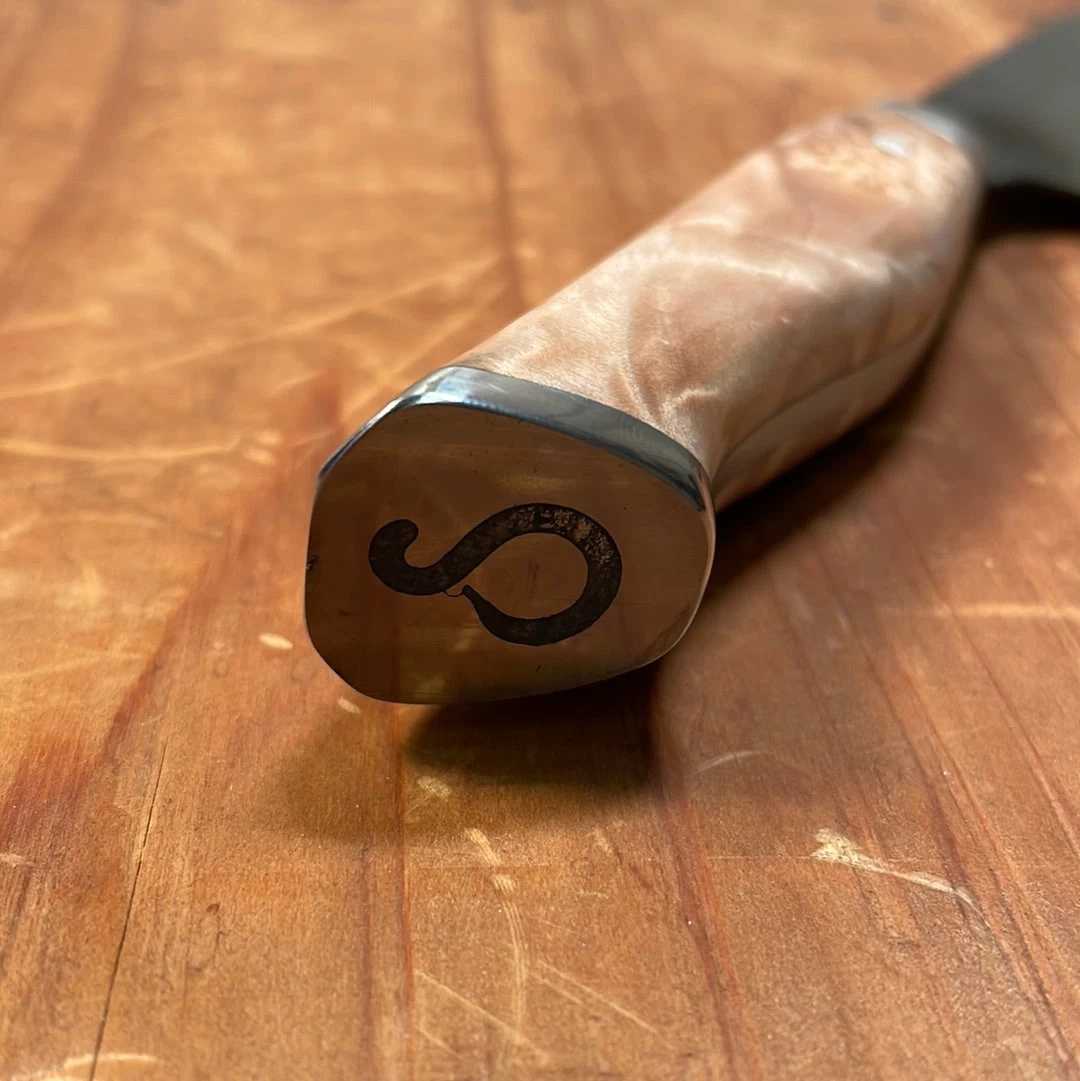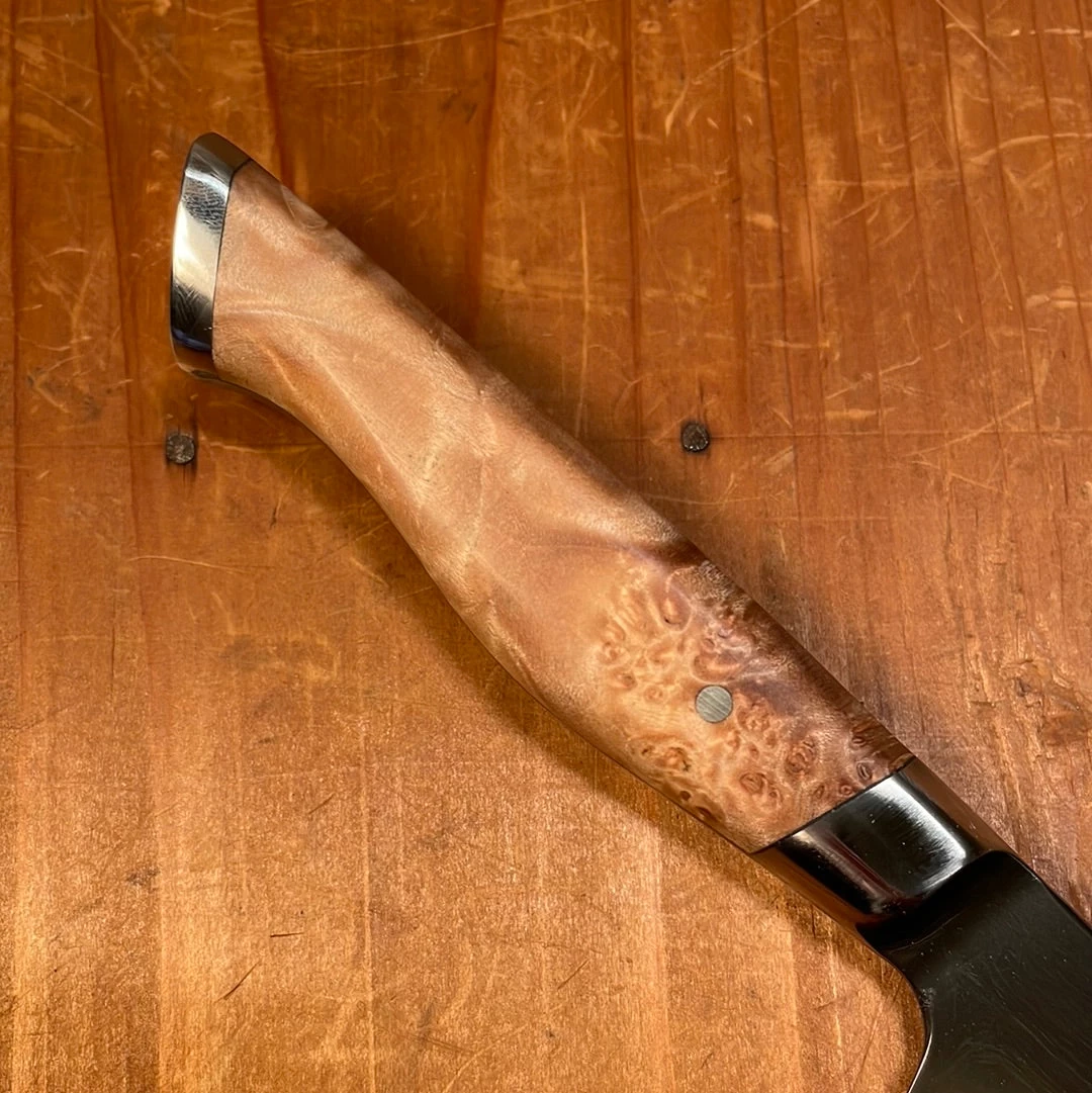 First the blade, bolster, tang and pommel are formed in a drop forge, the historical driver of fine American industrial cutlery that has largely disappeared from American cutlery. Next a proprietary 8 stage heat treatment with both oil quenching and air cooling finished by a cryogenic treatment in liquid nitrogen is done one knife at a time. The edge half of the blade is hardened to 65 HRC with the spine and handle being under 40 HRC. The blade is convex ground and polished with heel and spine ground with eased edges, and after an etch in coffee the knife is completed with a stabilized Oregon bigleaf maple handle. Each knife is unique in both the pattern of the maple burl and the banding in the grain of the steel visible from the coffee etch.