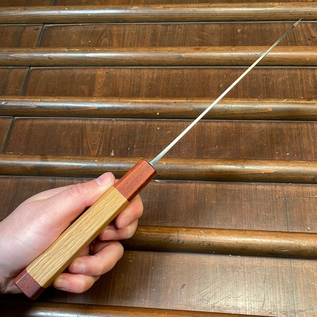 These are forged in stainless clad shirogami 2 with a mIgaki matte polished finish, they have the classic Sanjo geometry with strong distal taper and a square leaning oak and wenge octagonal handle, also made in Sanjo specifically for this series.