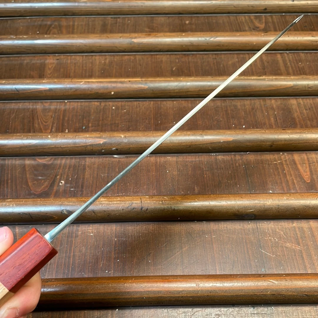 These are forged in stainless clad shirogami 2 with a mIgaki matte polished finish, they have the classic Sanjo geometry with strong distal taper and a square leaning oak and wenge octagonal handle, also made in Sanjo specifically for this series.