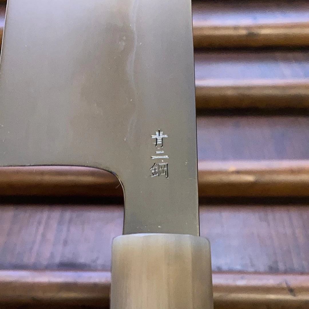 This water quenched aogami 2 honyaki series is hand forged at Nakagawa Hamono (formerly Shiraki Hamono) by the super talented blacksmith Nakagawa-san and hand ground with a graceful thin convex grind and beautiful finish bringing out the more subtle aogami hamon line by Mitsuaki Takada at the Takada no Hamono workshop.