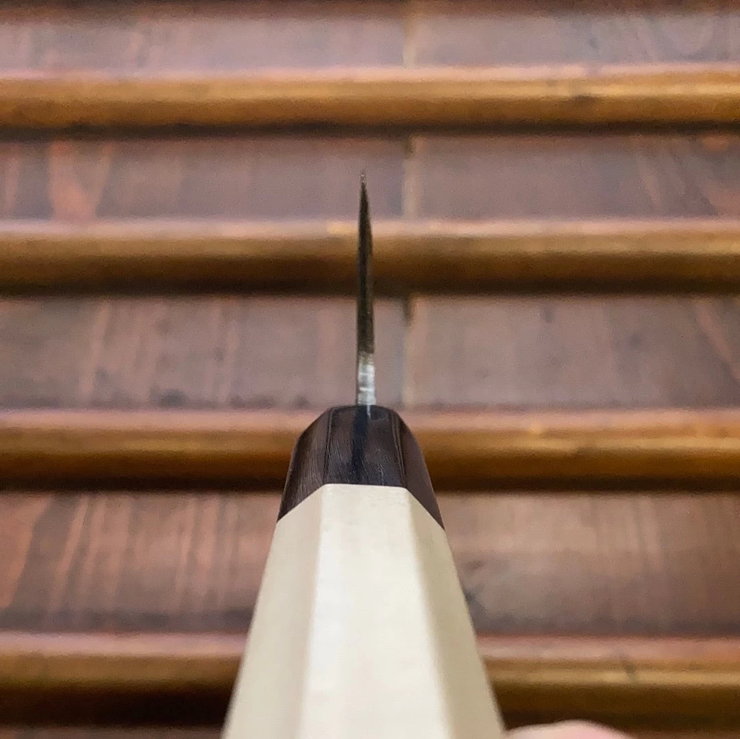 Stainless clad aogami 1 gyuto forged by Tosa Tadayoshi to Bernal Cutlery specifications. This work horse hand forged gyuto is designed especially with a forward rocking push cut in mind for a mix of vegetable and boneless protein work. These have enough height at the heel to work well for those with larger hands but not so tall as to sacrifice control. The tip is designed to be in line with the inside of the handle to provide enough belly for a rocking push cut but also to provide good control for fine work at the tip and a bit of flat spot at the heel to provide fast contact.