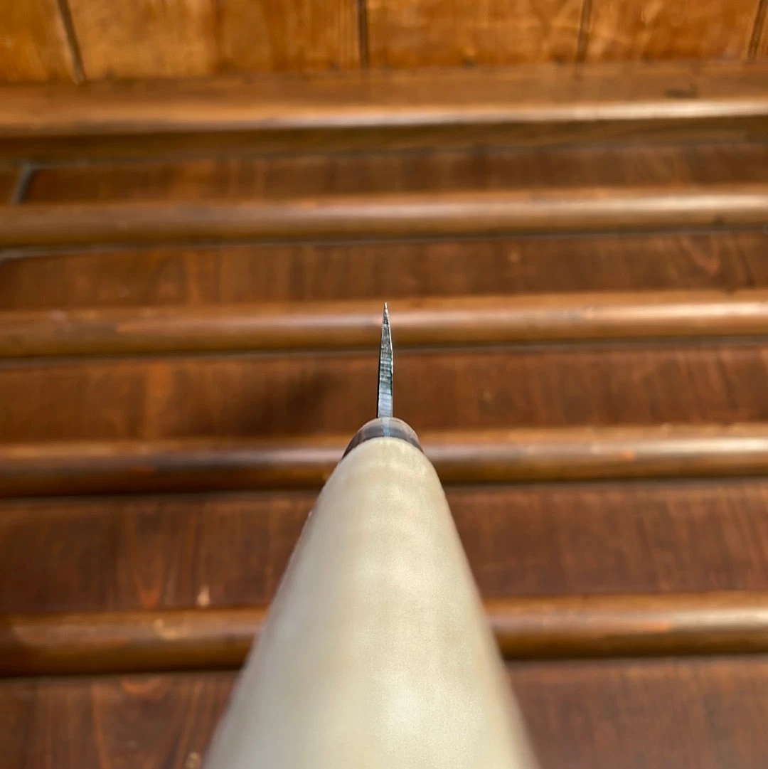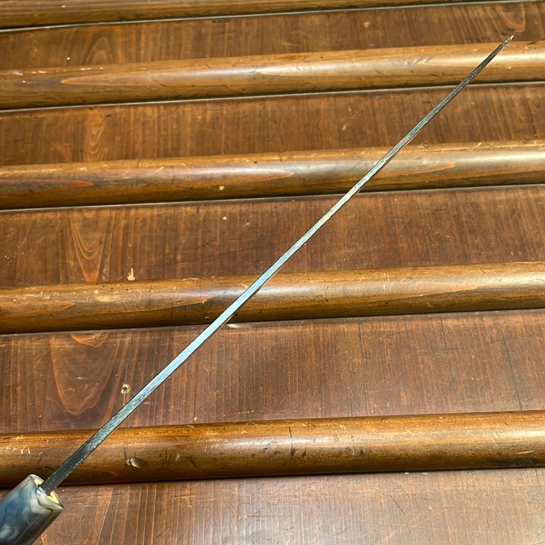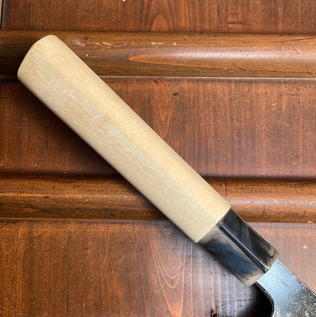 Tosa Tsukasa 210mm Sujihiki. Iron clad shirogami 1 carbon steel blade, ho wood handle with plastic ferrule.