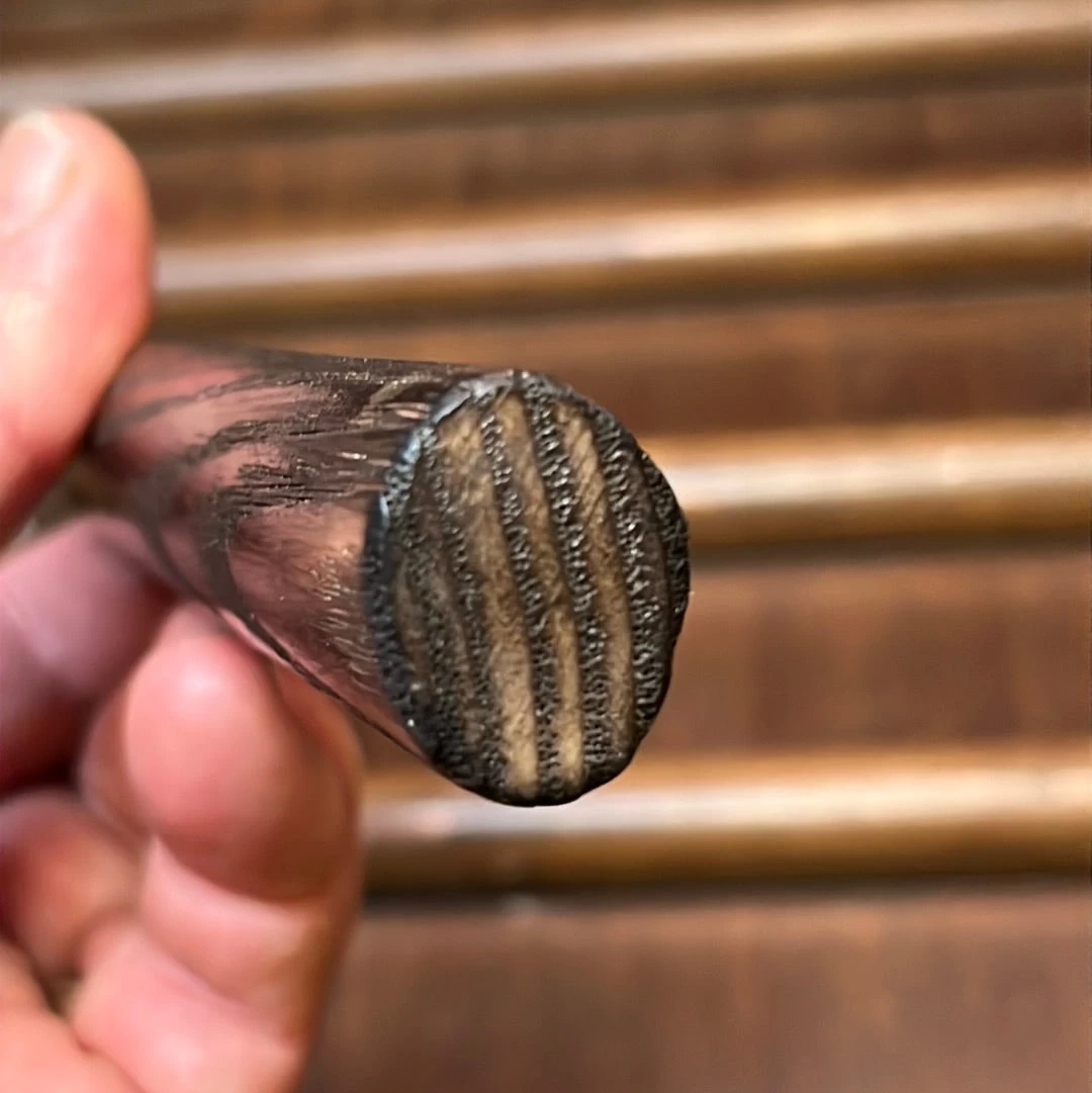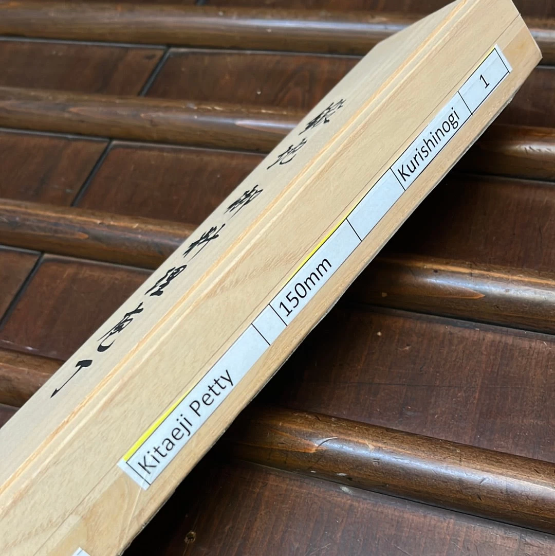 Hinoura-San’s ‘Kitaeji’ is hand-forged with a #2 shirogami, or white steel core, and a layered iron and mild steel cladding. Tsukasa Hinoura is famous for his heat treatments, coaxing incredible edge life and toughness out of the materials as well as creating mesmerizing patterns in his suminagashi damascus cladding.