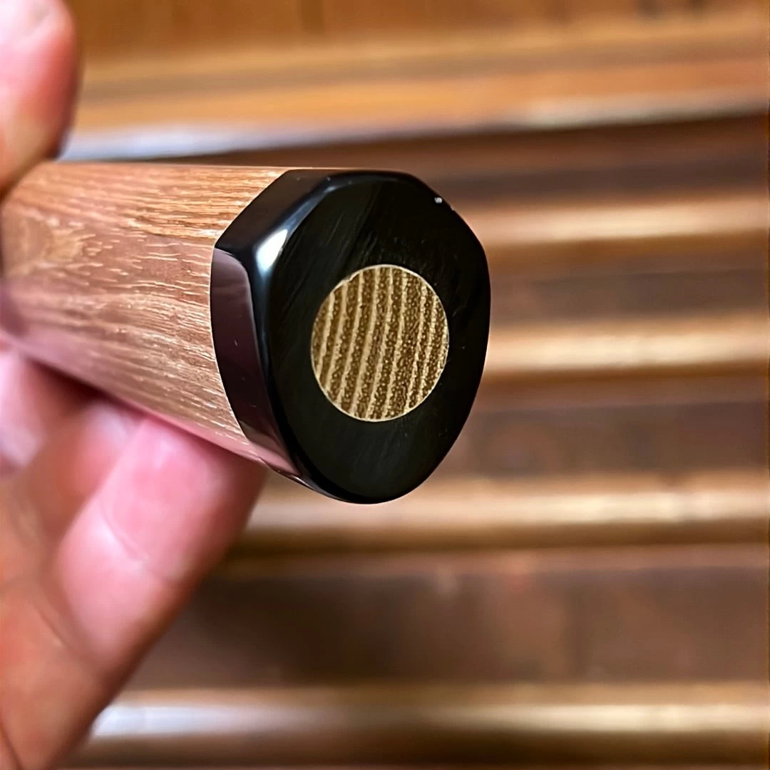Unlike the usual sandwiched layering of a hon kasumi knife, this series is made with the hagane (cutting layer core) with the iron jigane (cladding) folded around it. These knives are NOT stainless, and extra care should be taken to keep them dry when not in use. The blade will develop a dark patina with use, and any orange rust needs be removed with a light abrasive. Camellia oil is recommended on the blade in between uses.