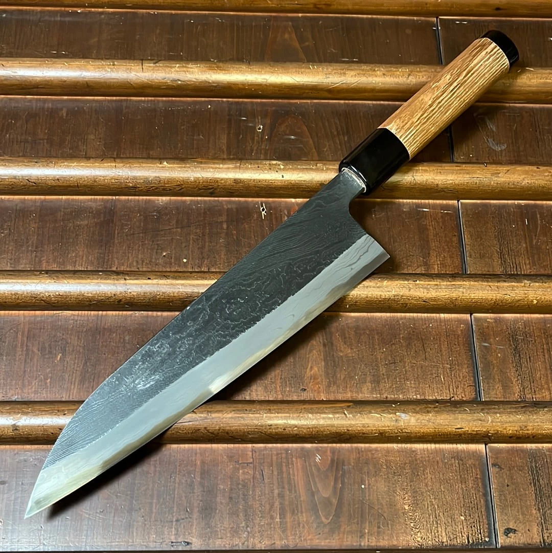 Tsukasa Hinoura is a third generation knife maker in Sanjo, Niigata, Japan. Hinoura-San uses no modern machinery in the production of his knives, and he does all the finish grinding and sharpening himself. From the forging of the jigane cladding, the warikomi forge lamination of the steel core and cladding, the water quench heat treatment to the final whetstone finish and all steps inbetween, traditional techniques are methodiacally employed. Hinoura-San is known for his examination of traditional Japanese blacksmithing with modern metalurgical microscropy, on both his own work and the work of other Japanese blacksmiths. All of his research supported the functional importance of traditional techniques that had been started to be viewed as antiquated or unnecessary with modern steels and the results in Hinoura-san’s steel quality are superb.