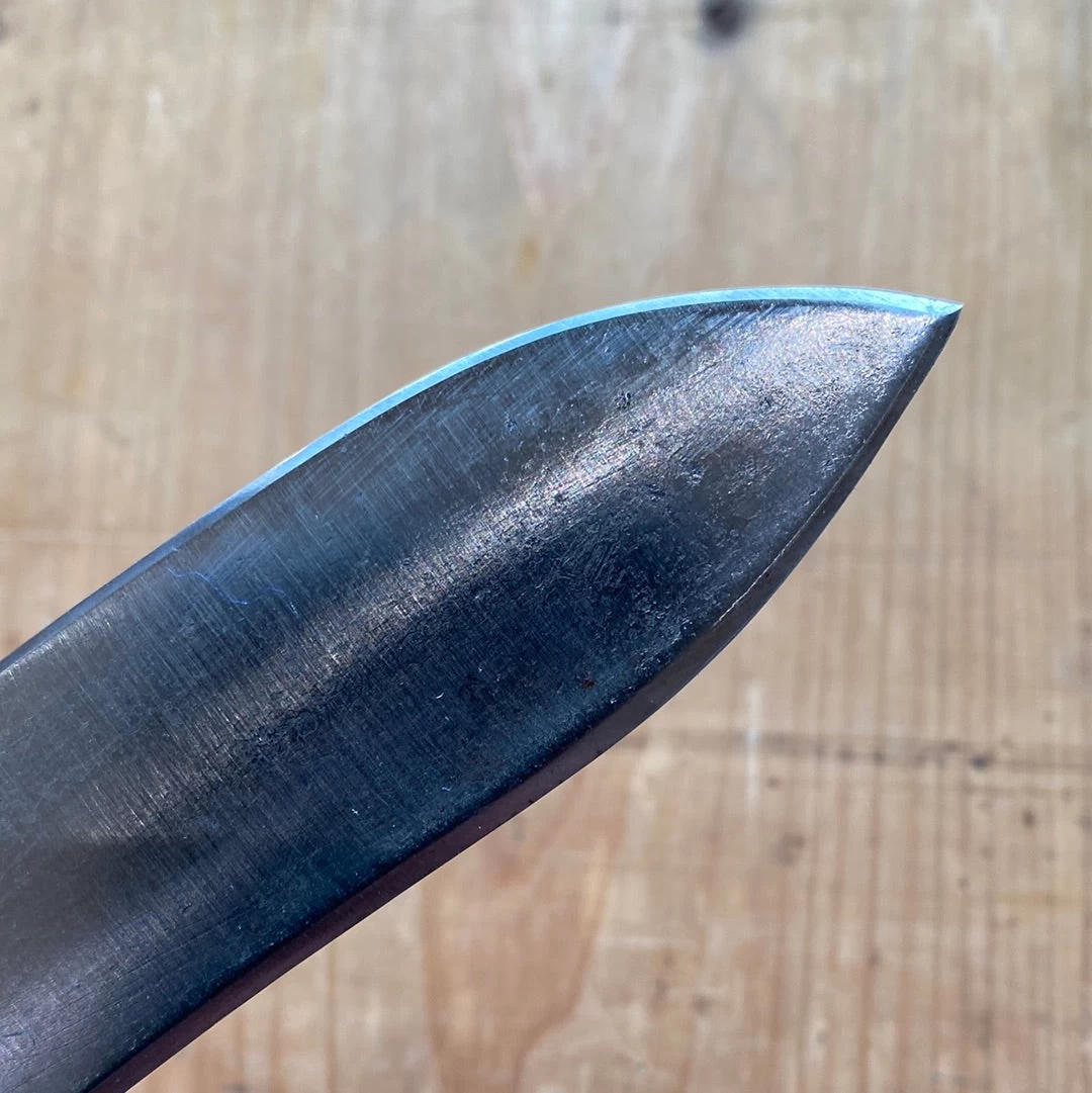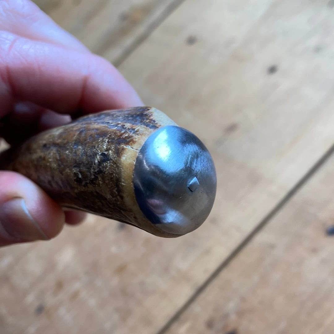 Alfred WIlliams carving knife with forged carbon steel blade, stag grip and round steel butt cap. Blade shape, round integral ferrule and rounded steel butt cap are classically English features.