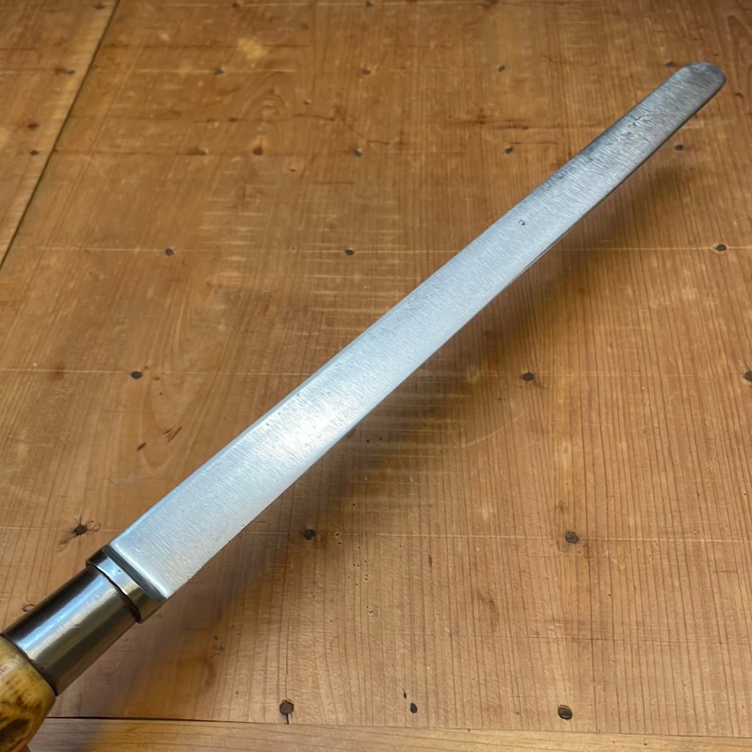 This knife has been re-ground and thinned behind the edge on a large 3 foot diameter Japanese water stone wheel (kaiten mizu toishi) and then resurfaced with a medium fine finish, our take on an old style grinding and finishing technique. While the particular wheel used to refurbish this knife is typically used in Japanese knife making it is very similar to the old grinding wheels used to shape European and American hand ground cutlery. A convex face to a blade greatly increases a knife’s performance as there is less sticking as there is on a flat face and the blade does not get thick behind the edge nearly as fast as with a flat faced blade. Being that we are often working with old blades that need re-shaping and might have been rusted expect some minor imperfections, we try to give a fresh start to our re-ground blades with an eye towards their original grind style and keeping as much metal is needed on a blade when ever possible. Check out Bernal Cutlery co founder Josh Donald’s book Sharp to see these wheels in use and more about their history in Europe and Japan.Â
