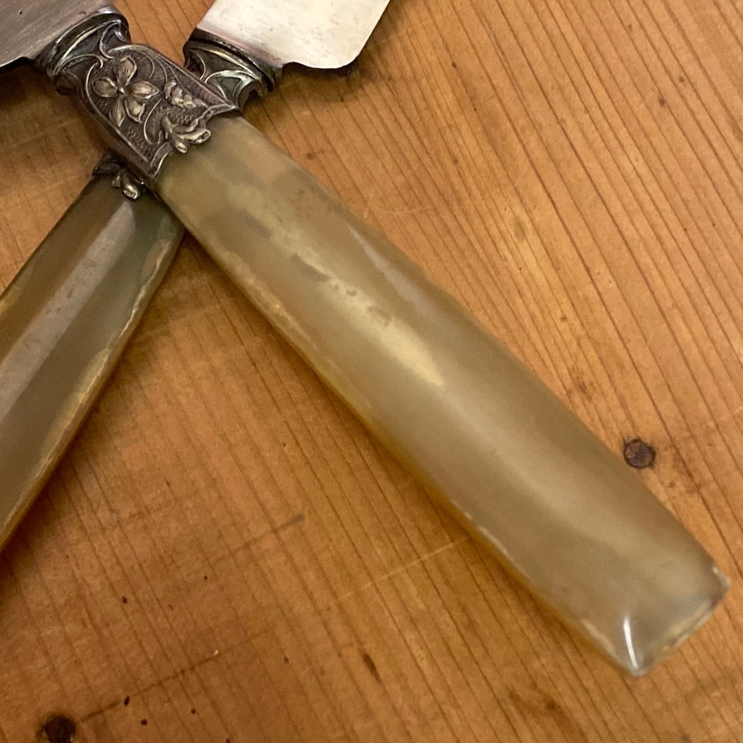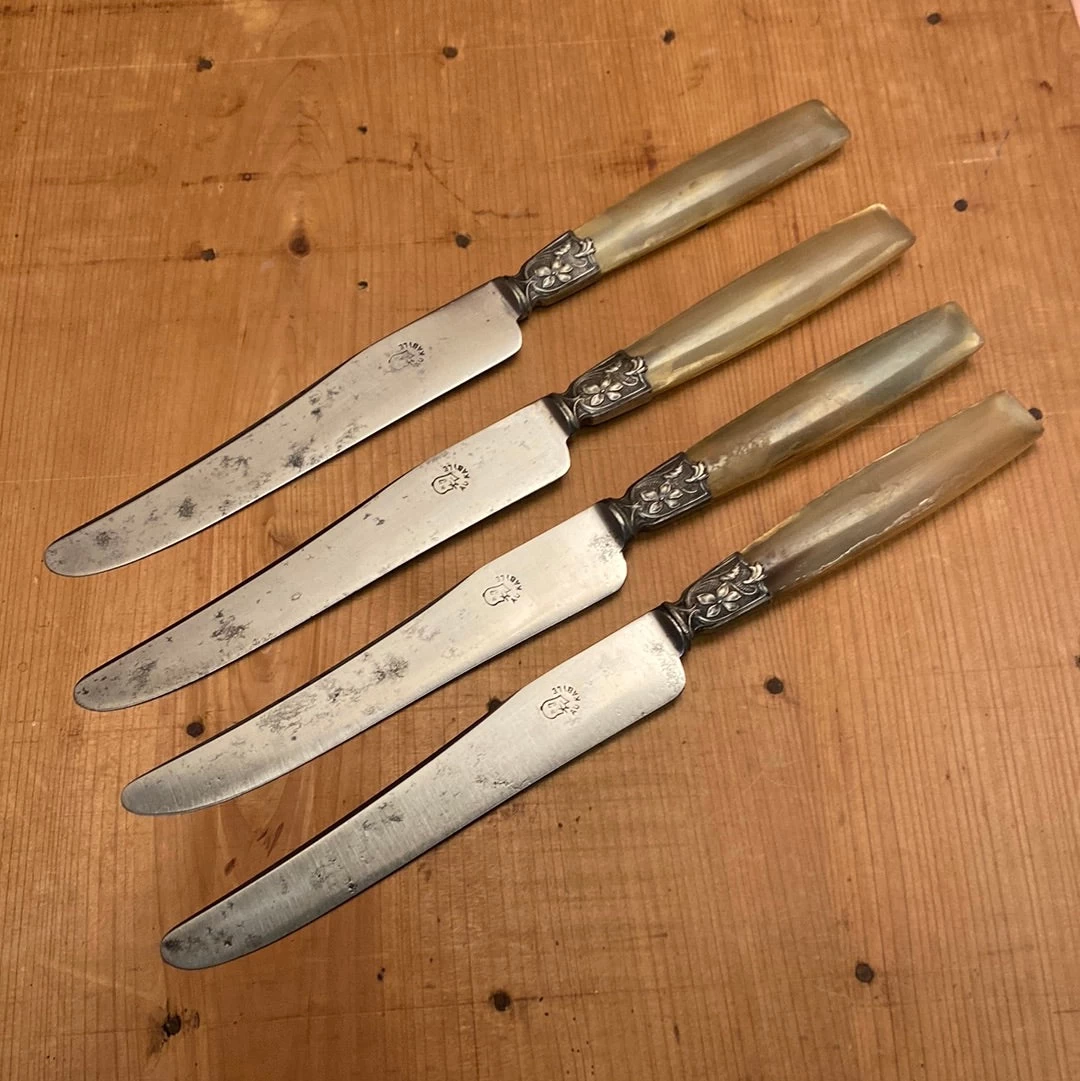 Antique Art Nouveau table knives marked Au Kabile. With carbon steel blades, nickel ferrules and blonde horn handles.
