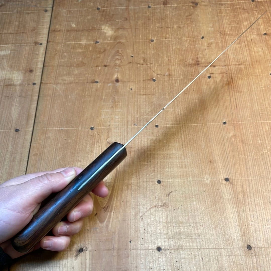Vintage carbon steel Dexter 8.5″ stamped (non forged) carbon steel wide flexible slicer with freshly sharpened blade and rosewood handle. This knife had seen a lot of use but has a new lease on life.